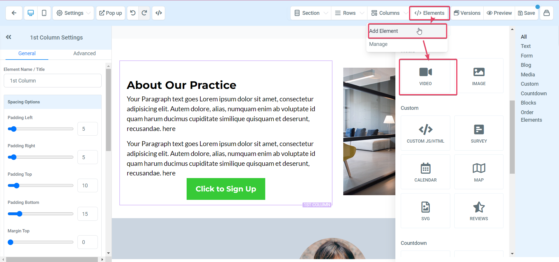 - To make use of the Hosted Video feature, add a video Element to your funnel: