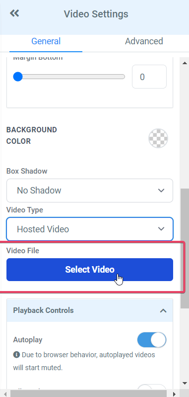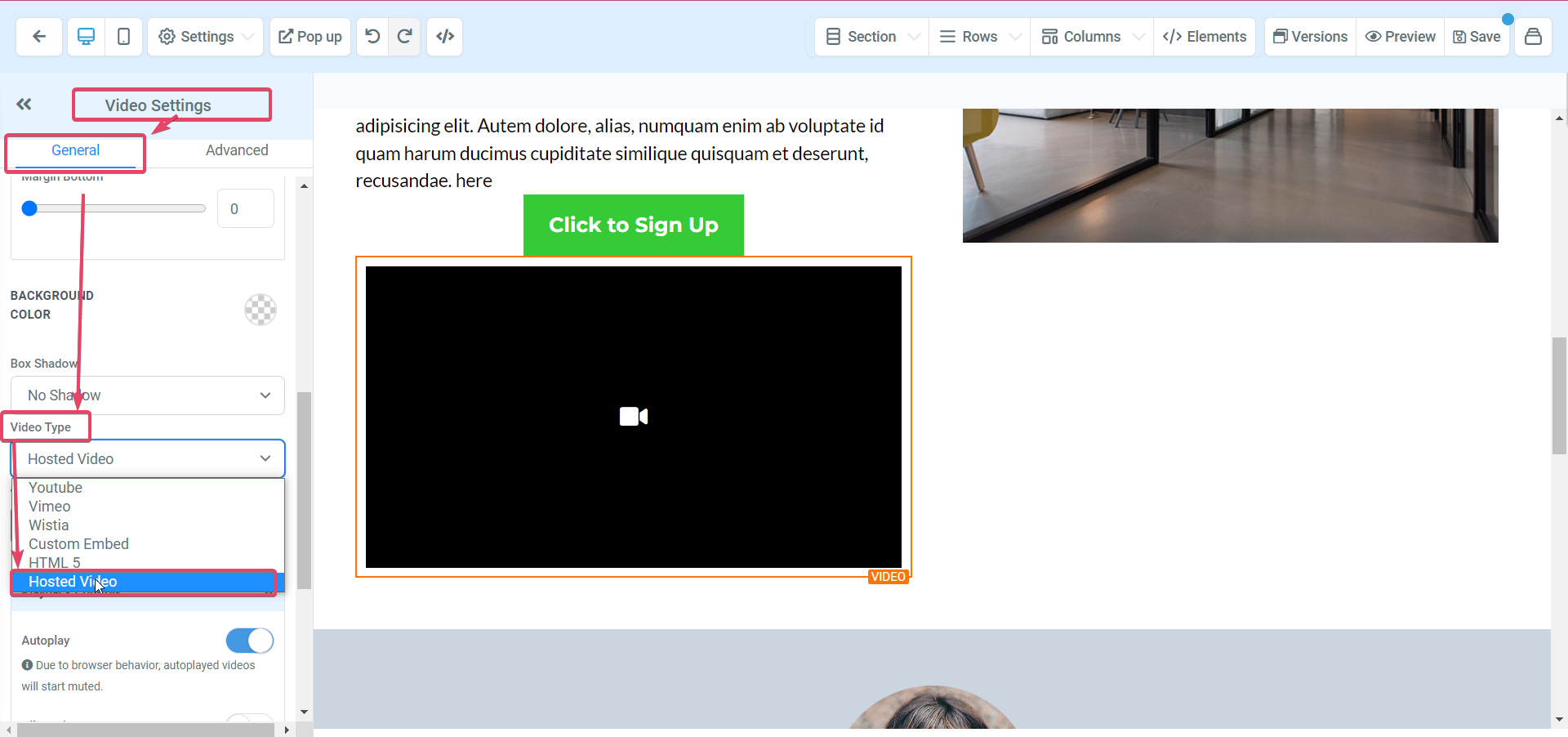 - Click on the Video Element, Go to Video Settings on the left and scroll down to Video Type > Choose Hosted Video: