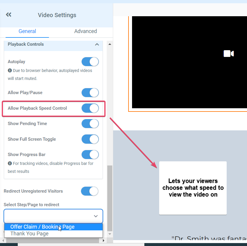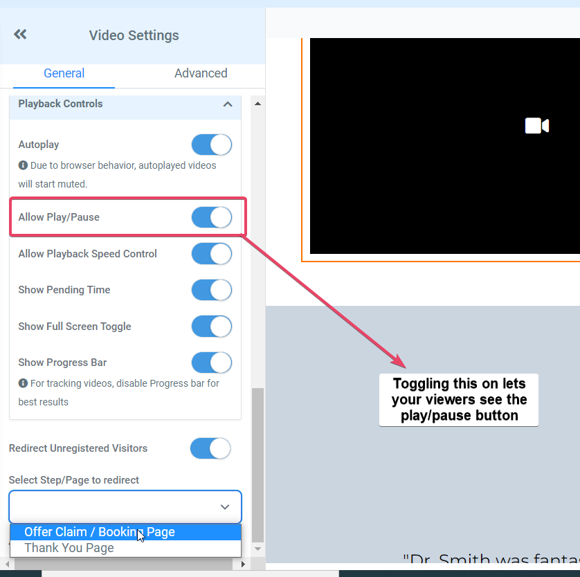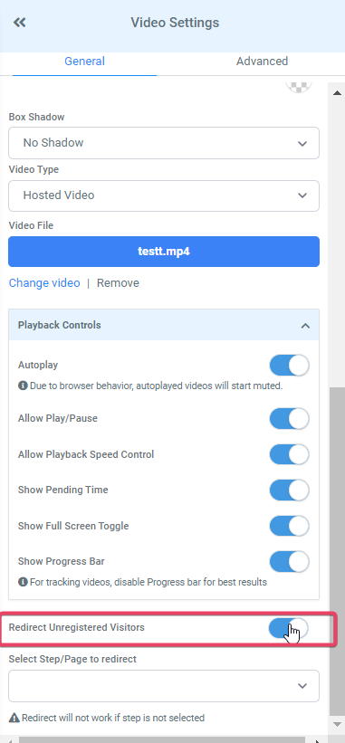 To avoid such a situation the Redirect Unregistered Visitors toggle can be used to push such visitors to another page which has an Opt-In Form so that they can fill in their name and other details, once they do that they would be brought back to the video. This redirect only pushes those visitors to your designated page that do not have any cookie attached to them which would have otherwise contained information about them.