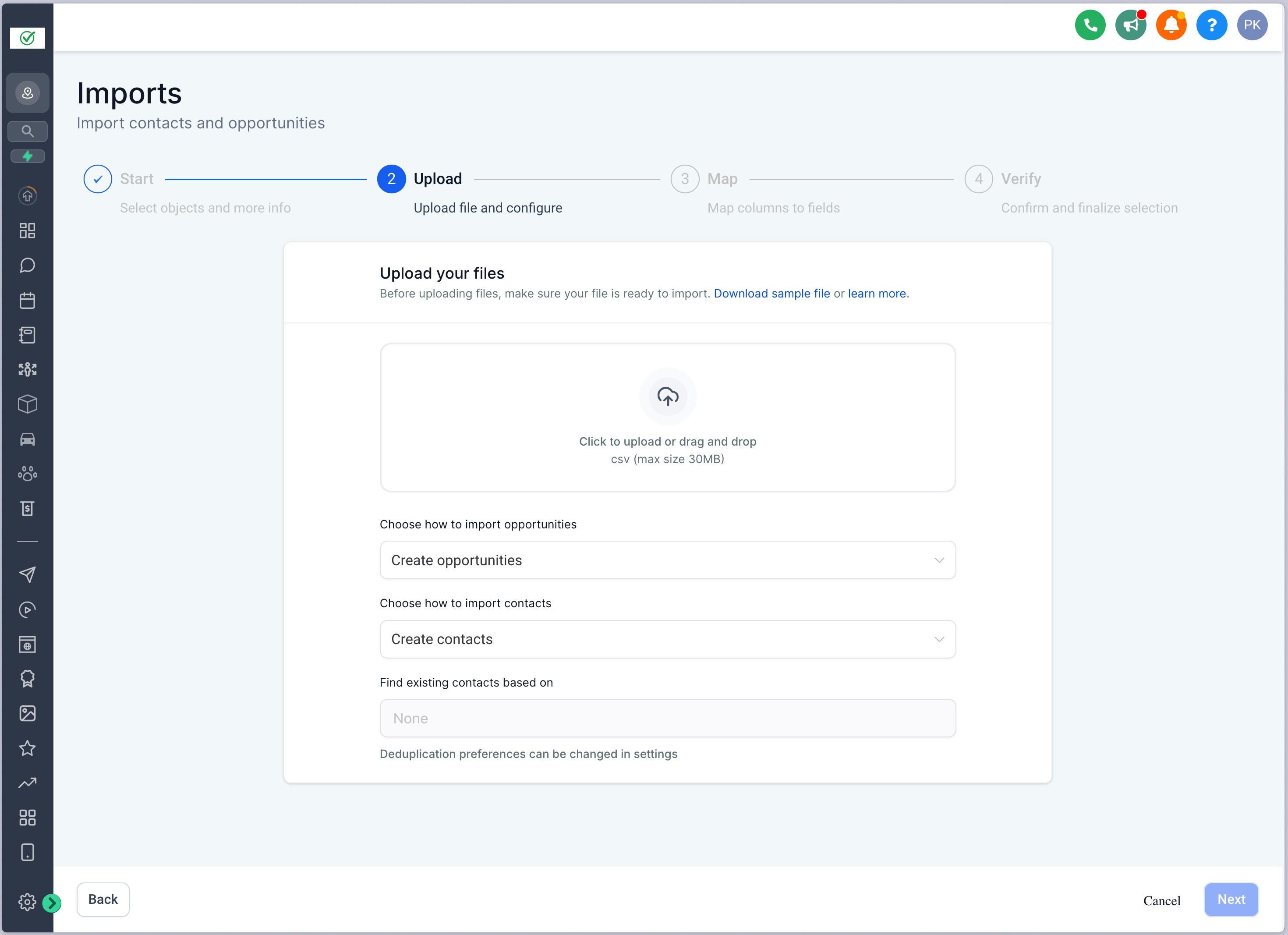 - Upload a CSV file containing details for both Contacts and Opportunities.