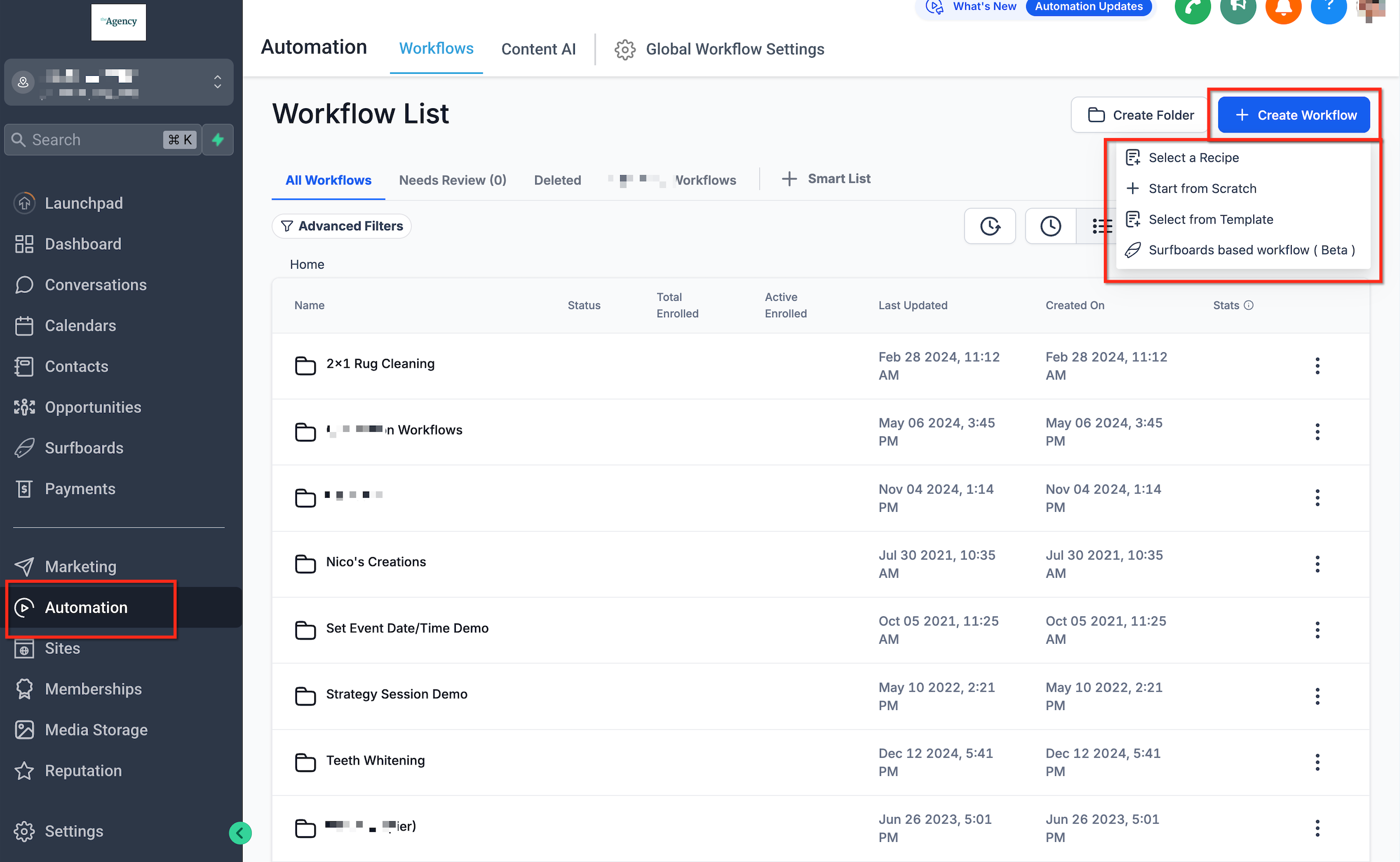 Head over to the "Automation" section of the CRM platform and select “+ Create New Workflow.” Choose “Start from Scratch” to build a workflow from the ground up or “Select a Template” to customize pre-built options available in the system. For those who wish to add this trigger to an existing workflow, locate the desired workflow, hover over it, and select it to begin editing..