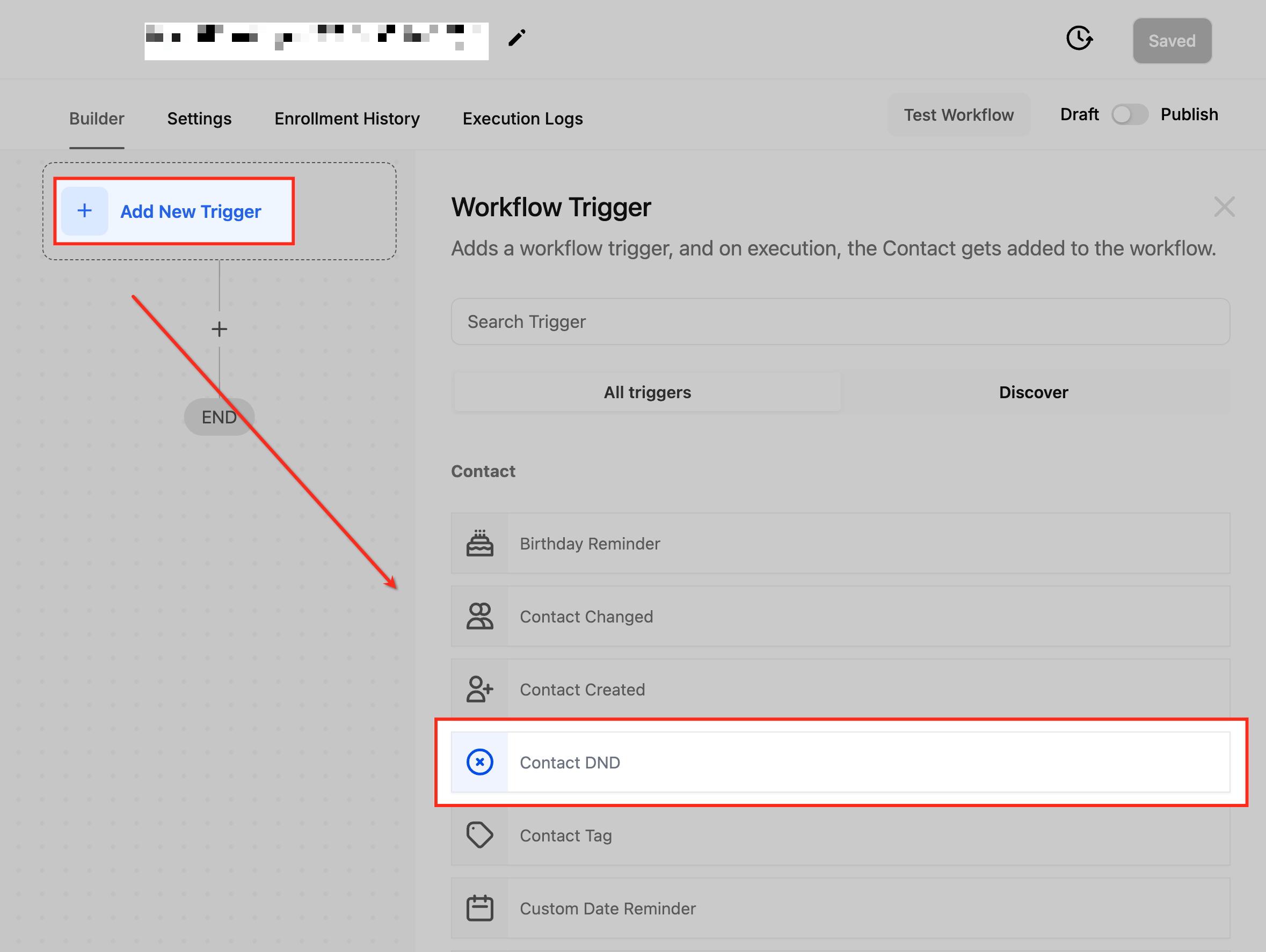 To start setting up the “Contact DND Workflow Trigger,” click the “Add New Trigger” button and search for “Contact DND” in the list of available options. This ensures the workflow activates whenever a contact’s DND status changes.