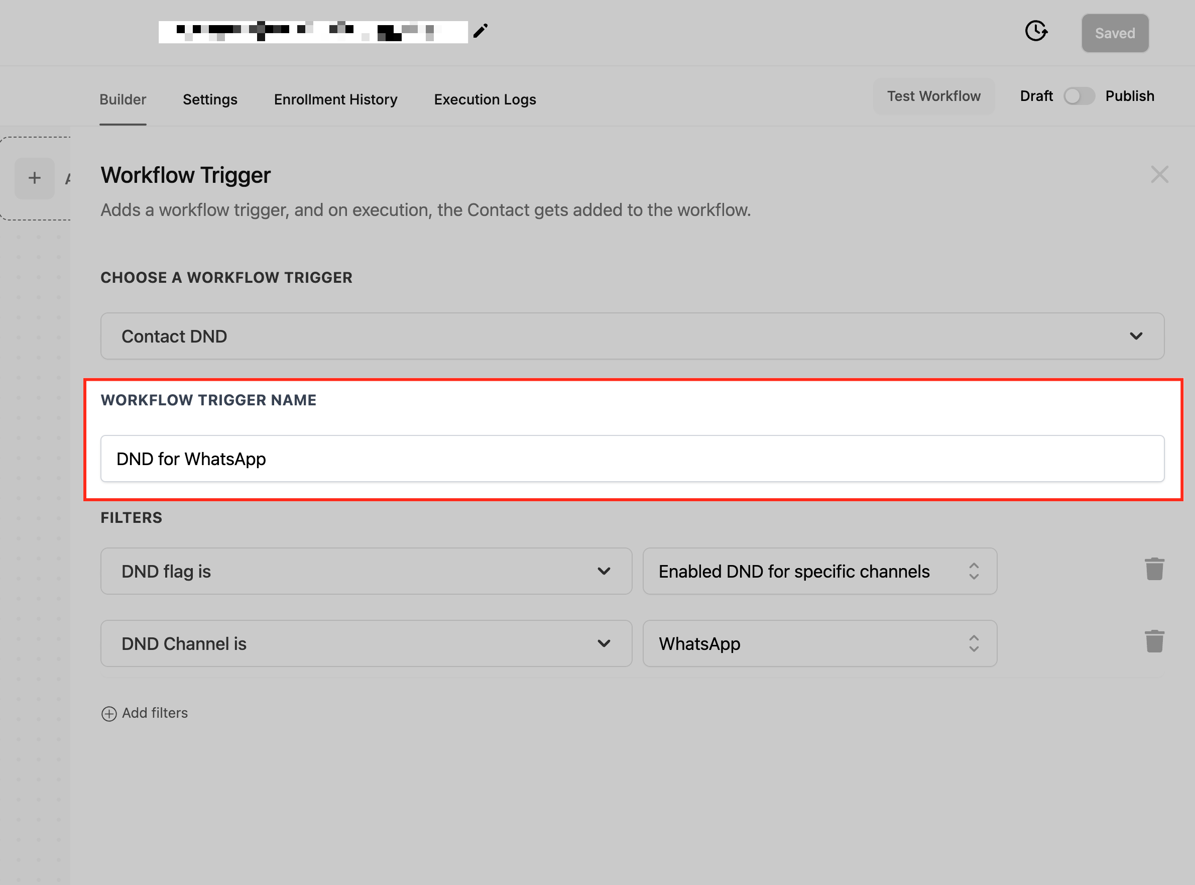 Assign a descriptive name to your trigger for easy identification. A clear name ensures that your workflows remain organized and simplifies locating specific triggers for future updates. In this example, we have named our trigger as “DND for WhatsApp.”