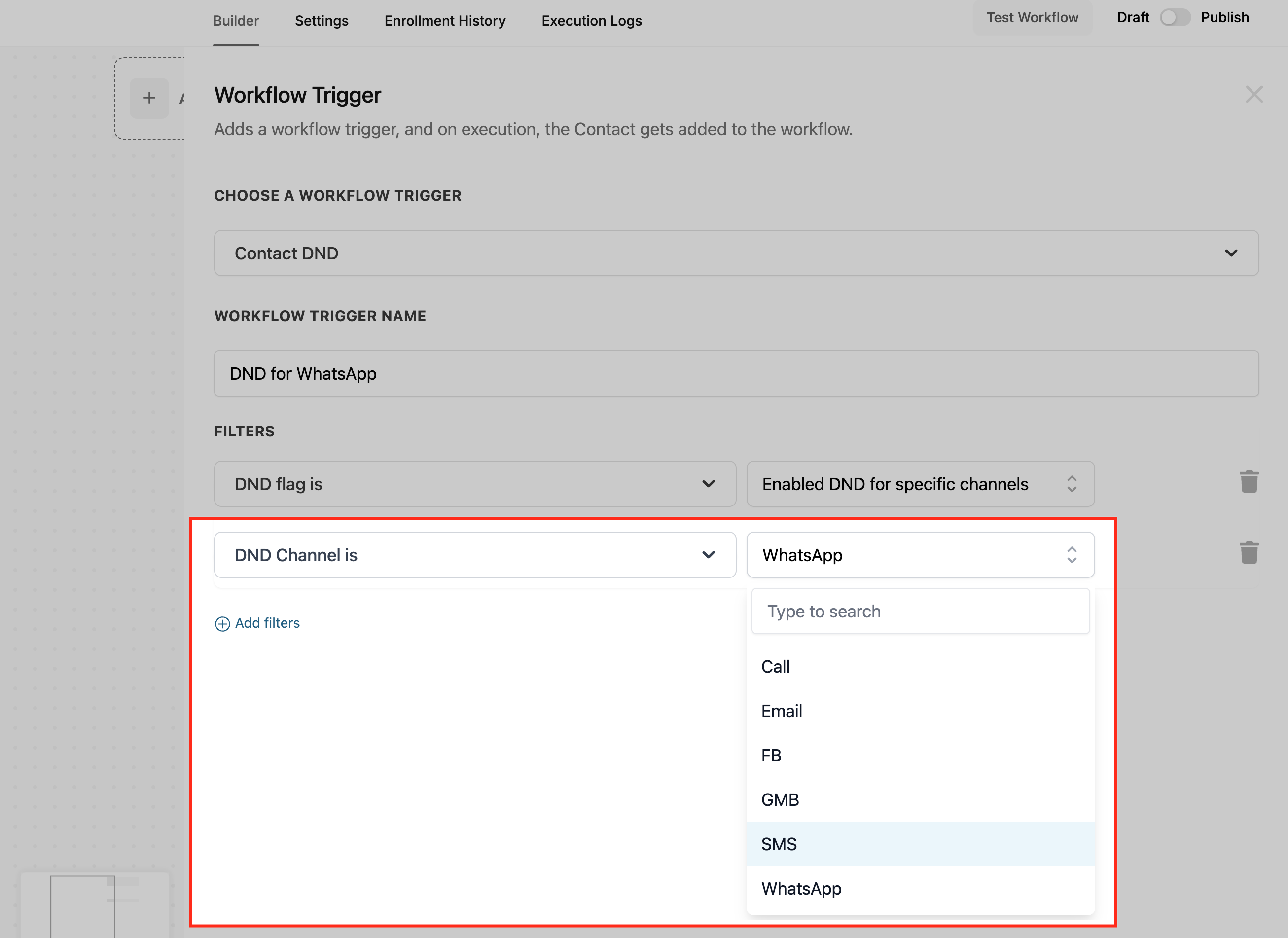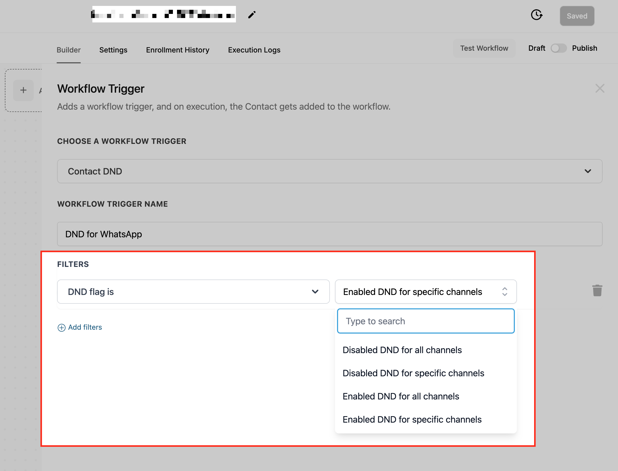 Setting up filter ensures the workflow activates based on specific conditions related to a contact’s Do Not Disturb (DND) preferences. Here’s how you can configure each filter.