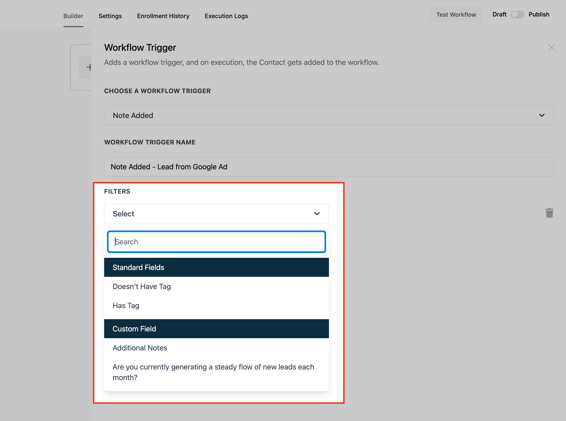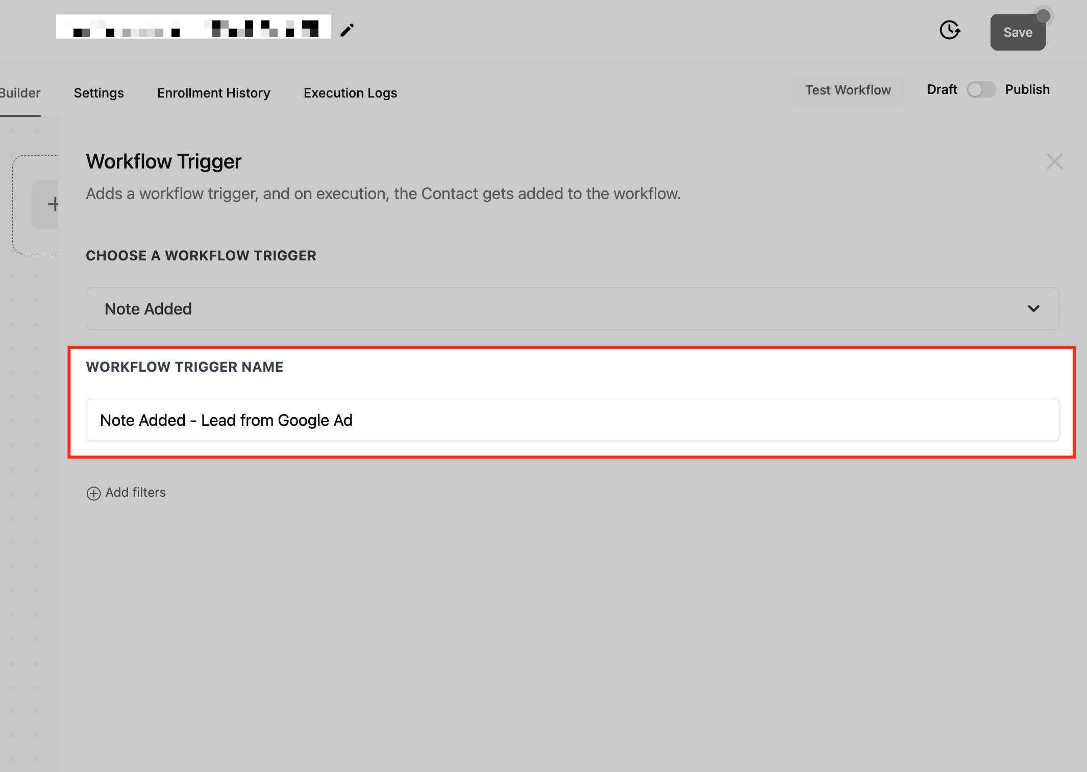 Navigate to the workflow automation section of your platform. Create a new workflow from scratch or select the existing workflow where you want to use "Note Added" trigger.