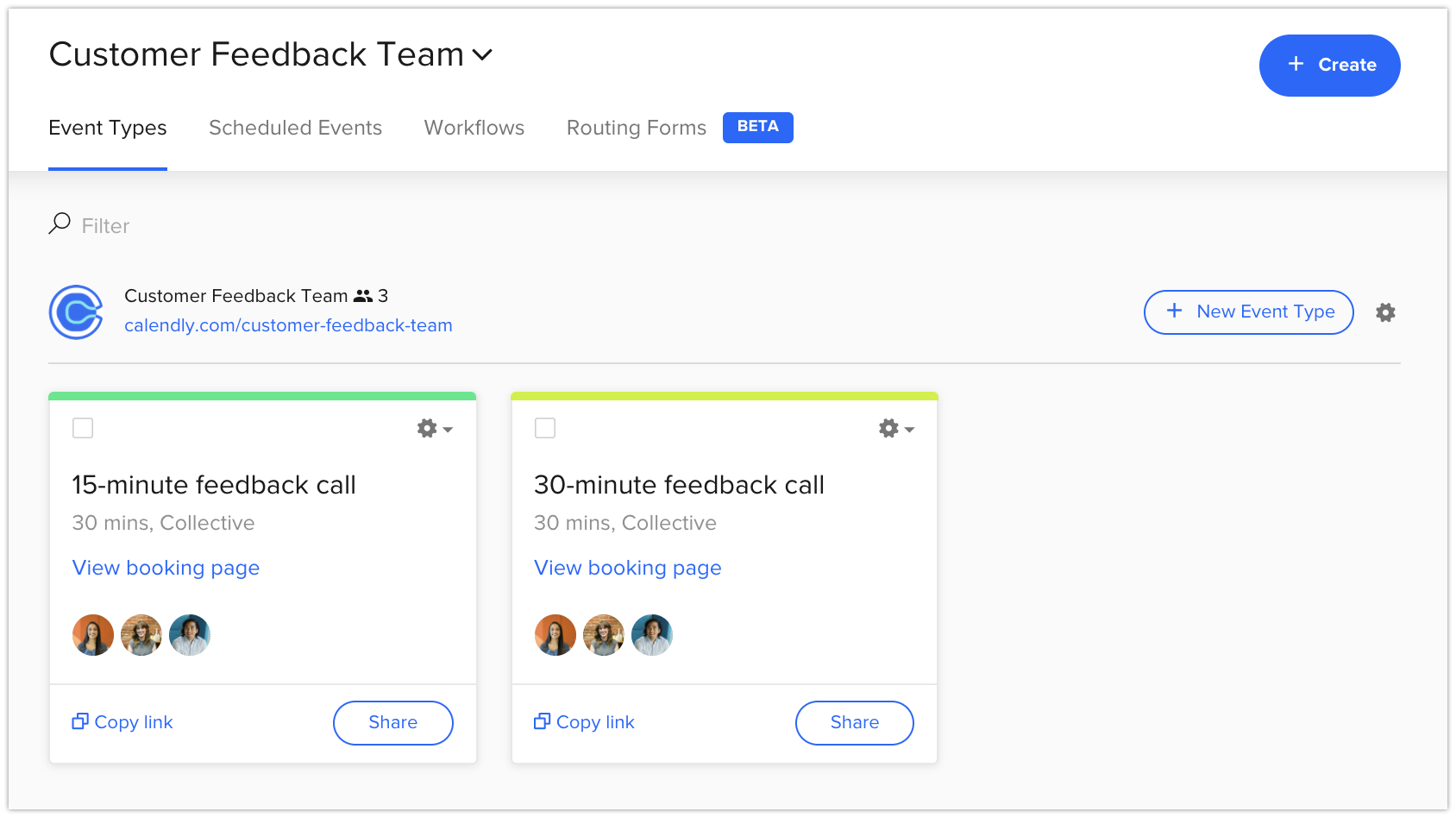 Calendly Supports multiple users in a Calendly Organization(think of this as an Agency level.) Each user gets their own Calendly account and individual Calendly page, along with event types you assign to their account.