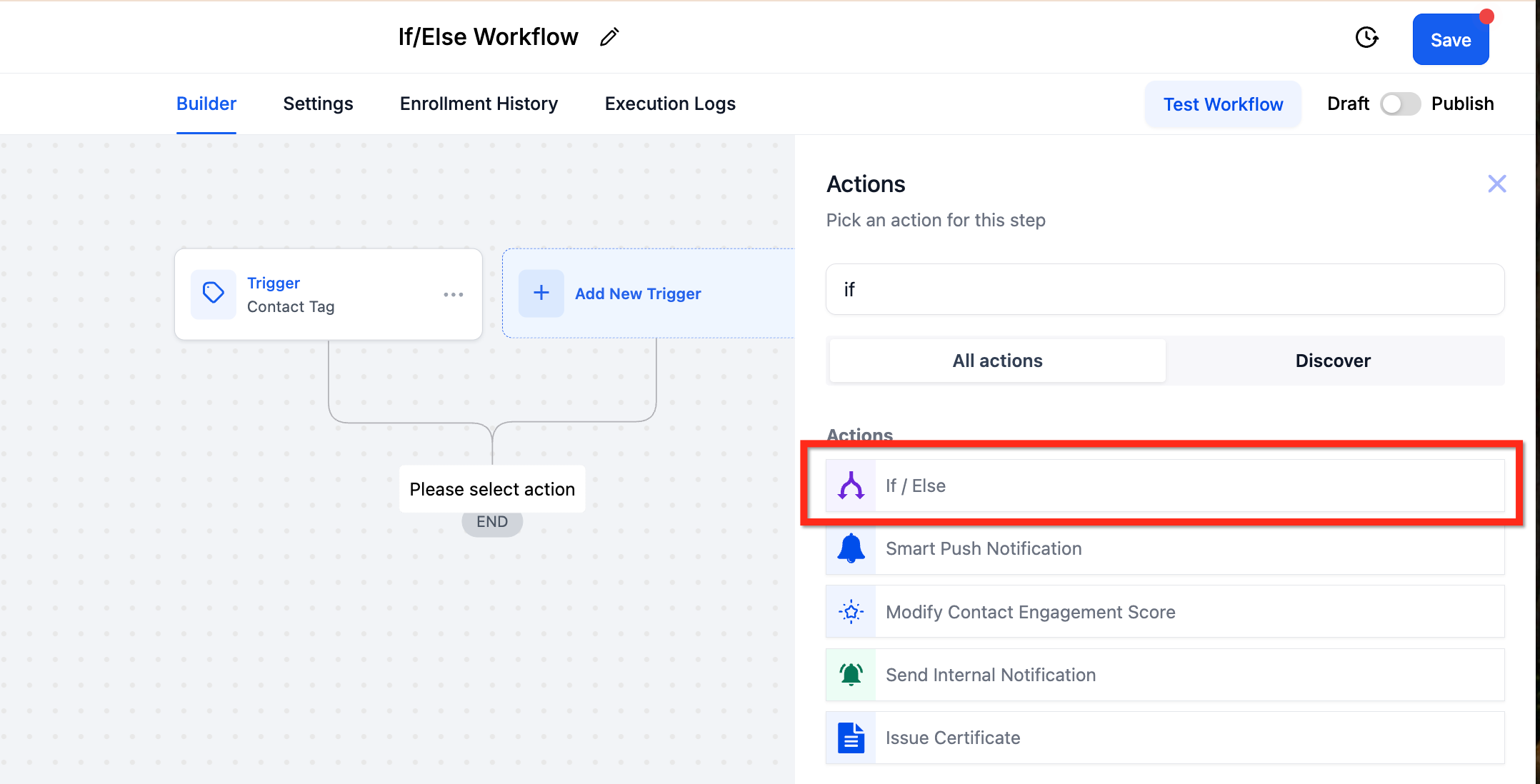 The If/Else action allows you to evaluate contact-specific data and route workflow automation based on whether the contact meets certain criteria. It creates two or more logical branches inside a workflow depending on whether a condition is true or false. his enables you to tailor subsequent actions according to the contact’s engagement or characteristics.