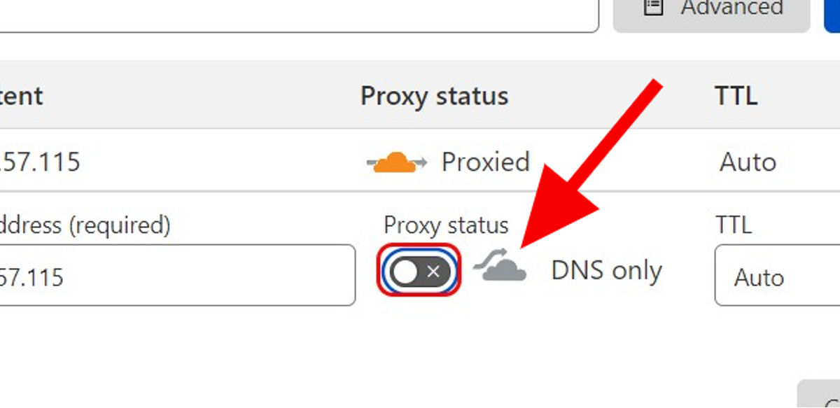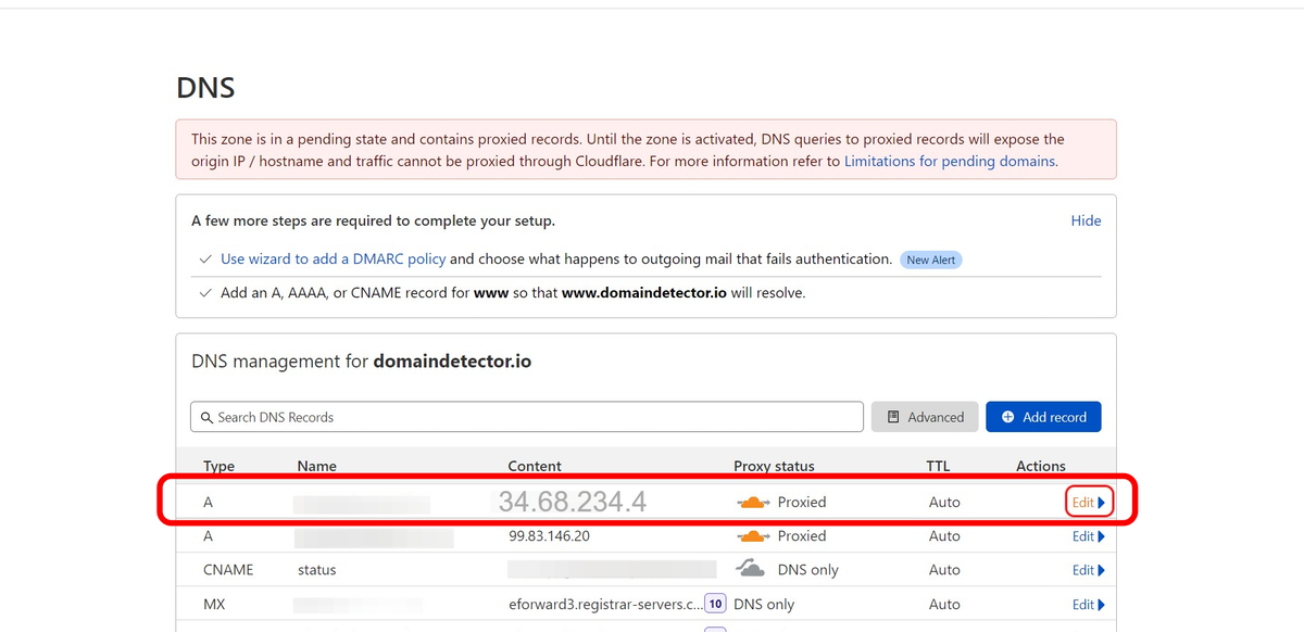 - Add A record for the non-www domain pointing to 34.68.234.4 and keep the Proxy Status "DNS Only"