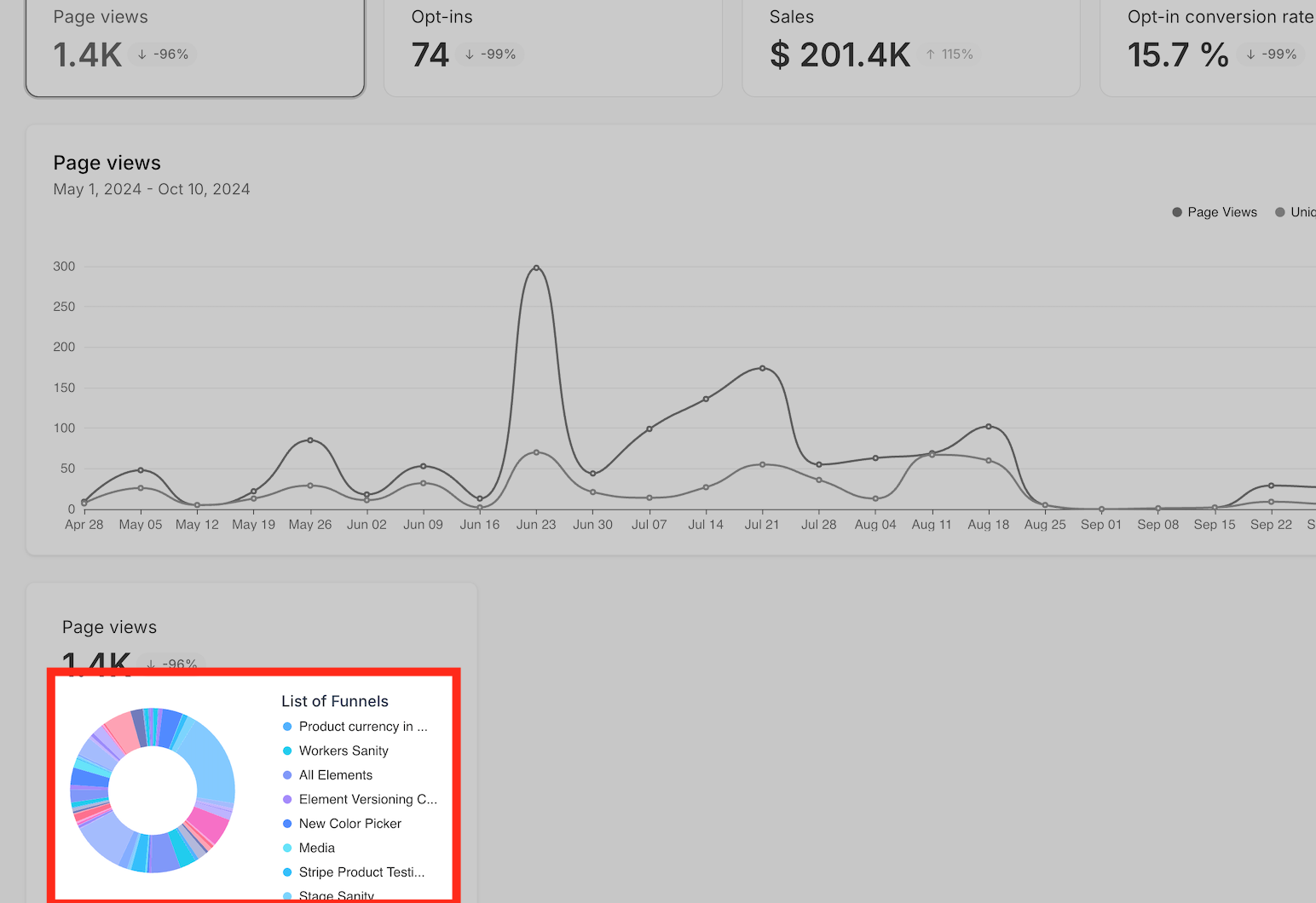 With this chart, you can quickly see how page views and sales are distributed across different funnels or websites. This helps you understand where traffic is flowing and where sales are happening, so you can focus on optimizing these areas to increase conversions.
