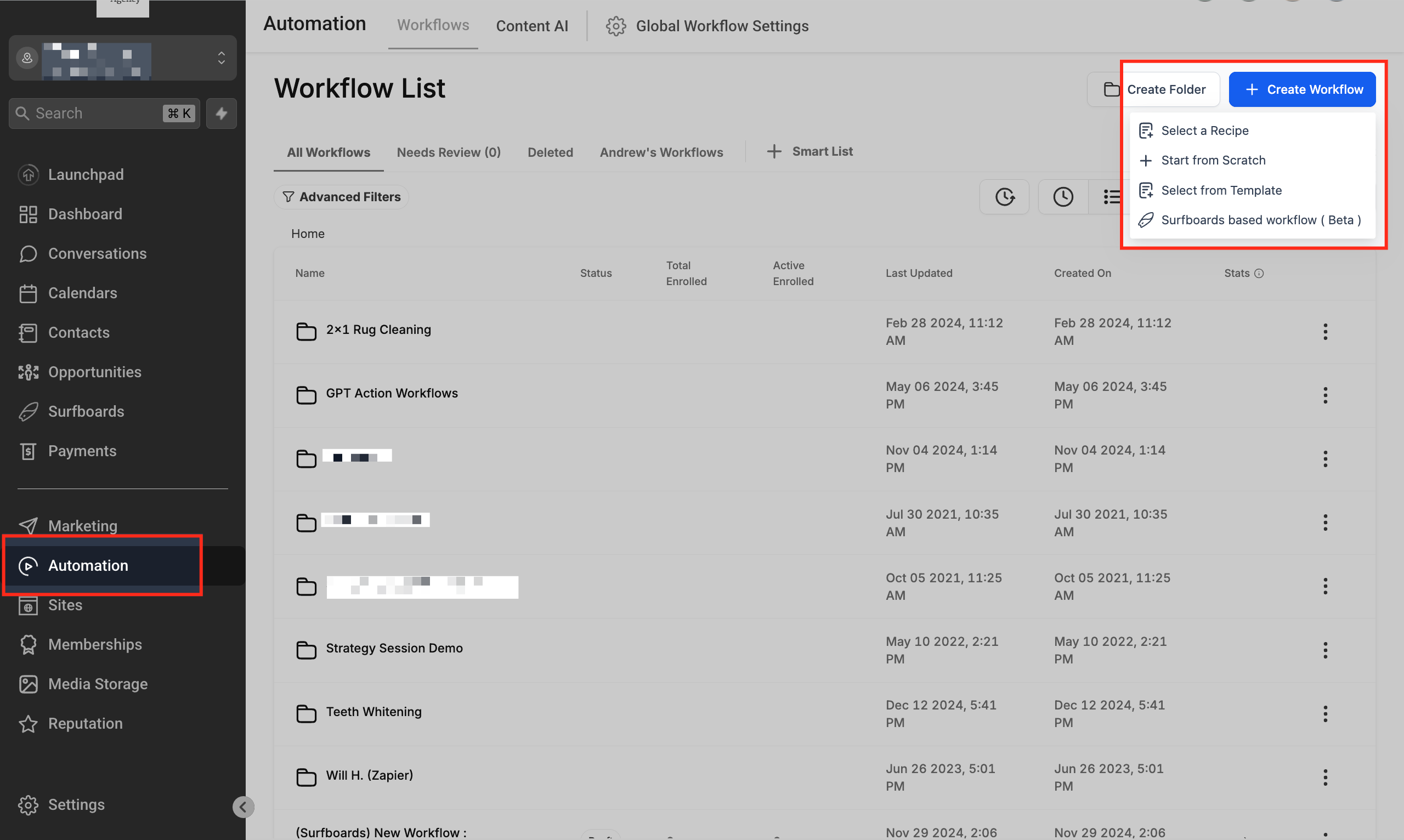 Start by navigating to the Automation section in your HighLevel dashboard. If you’re setting up a new workflow, click + Create Workflow and then select + Start from Scratch. Alternatively, you can modify an existing workflow to include the Task Completed trigger.