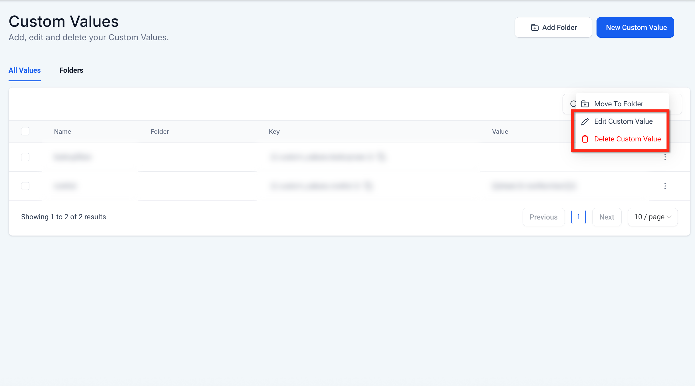 - Click the 3 Dots icon (⋮) next to the entry and select Edit Custom Value or Delete Custom Value.