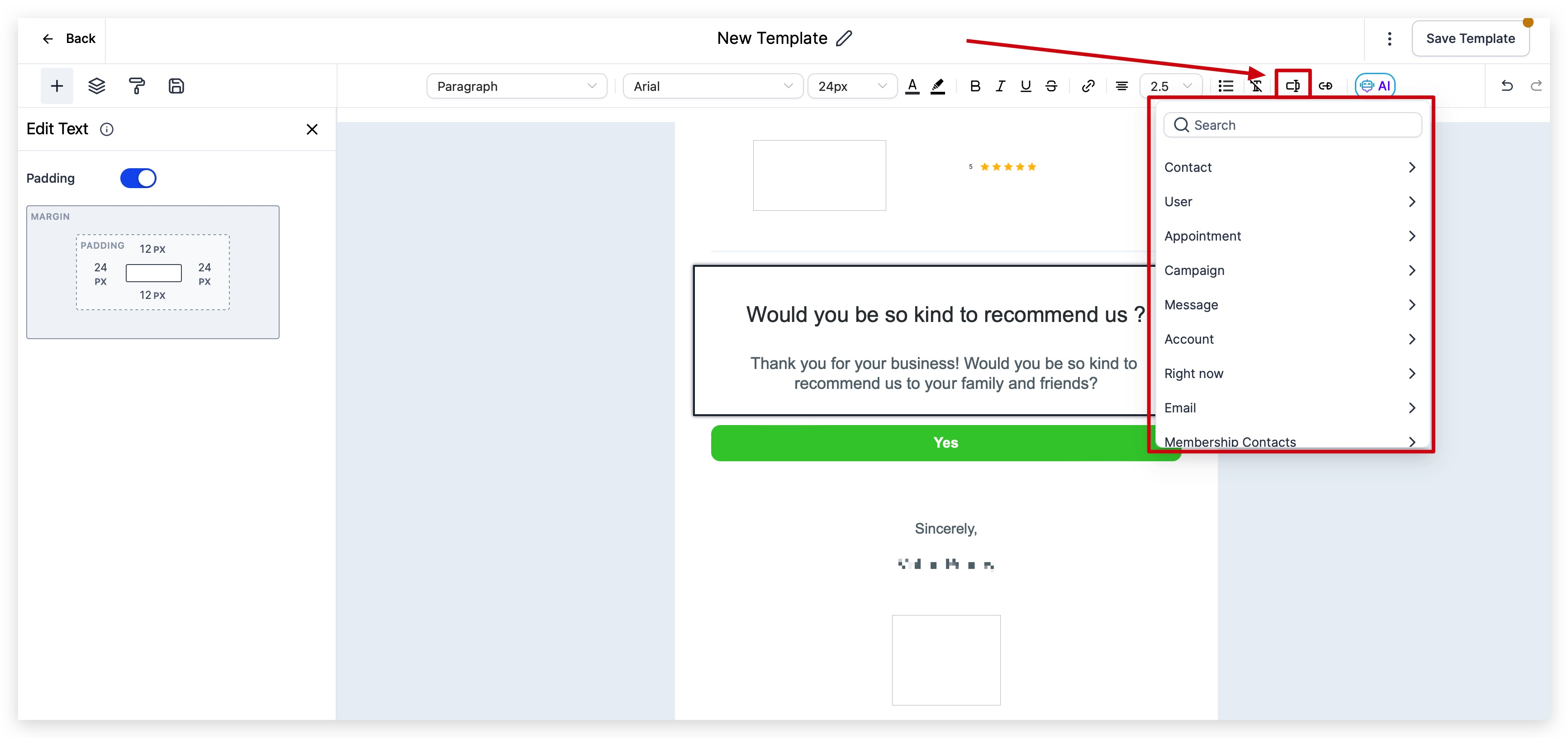 - When building emails templates and email campaigns inside the Marketing section, you can add custom values in a few different area to add personalization to your emails.