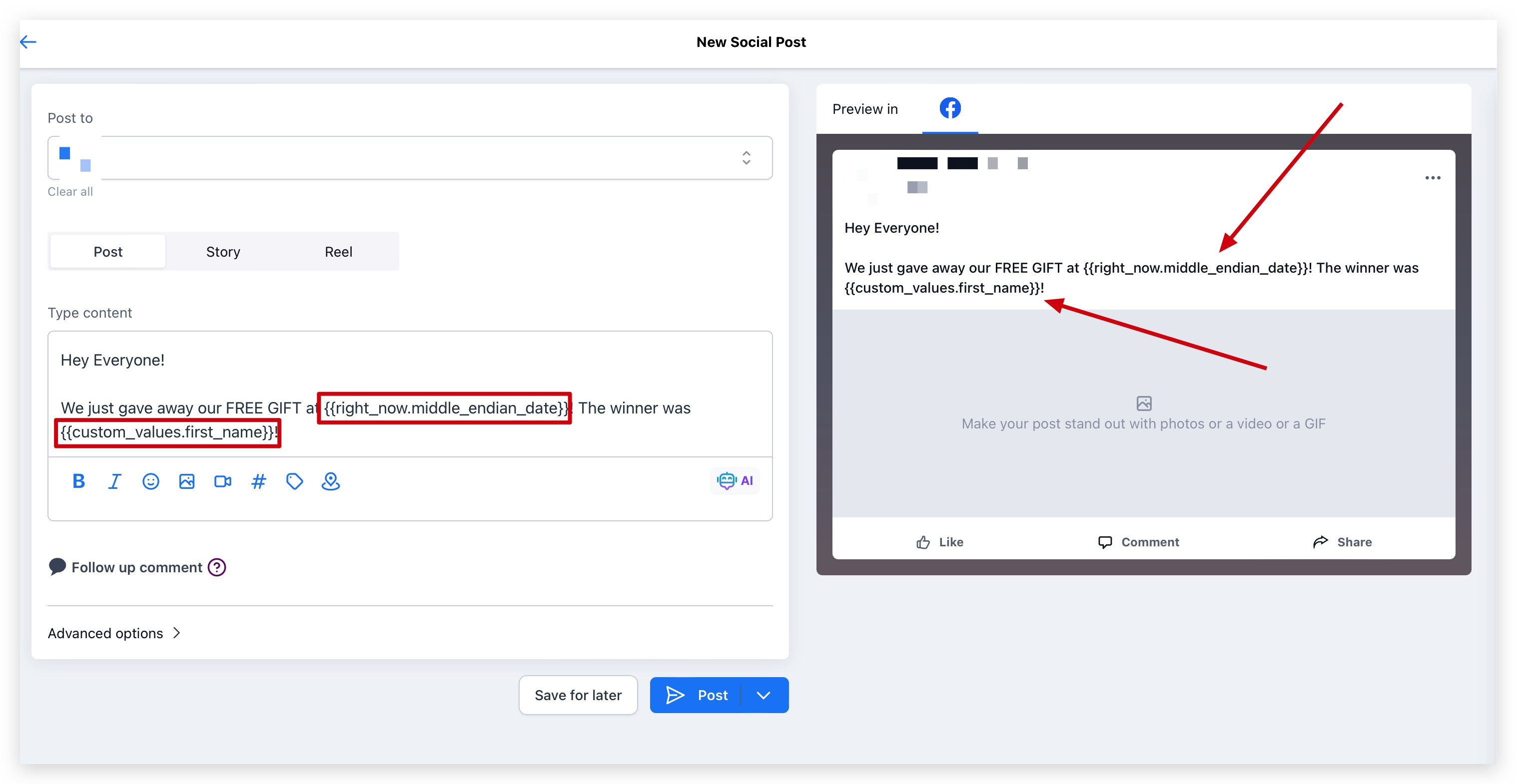 - Adding custom values in your social media posts can make posting fast and easy, and also add personalization to your posts no matter who is submitting the post!