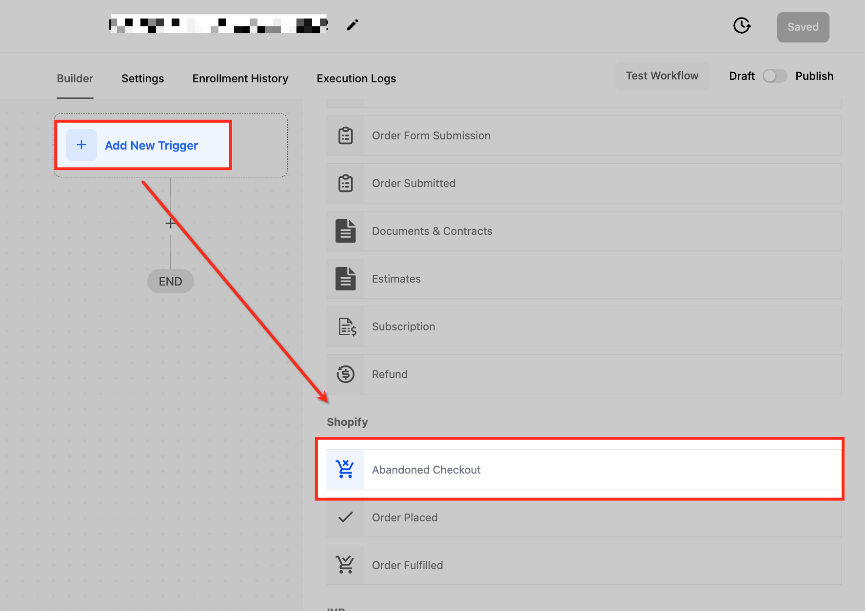 The Abandoned Checkout Trigger activates a workflow whenever a customer adds items to their cart but does not complete the purchase within a specified timeframe. This feature helps businesses re-engage potential buyers by sending personalized reminders, offering incentives, or triggering internal notifications for follow-up.