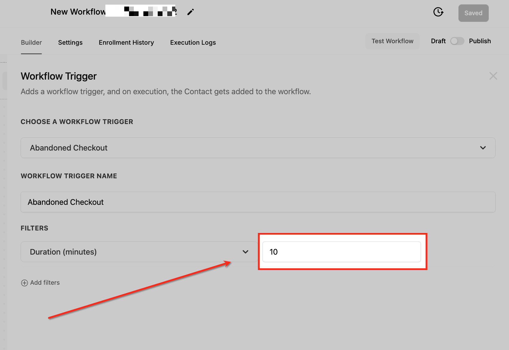This filter allows you to set the waiting time before considering a checkout abandoned. Choose the duration in minutes (e.g., 10 minutes means the checkout is marked as abandoned if the customer doesn’t complete the purchase within 10 minutes). The trigger activates once the set duration passes, sending automated follow-ups.