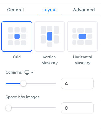 - Set Gallery Layout by choosing between grid or masonry options, and adjust the column count and spacing as needed.