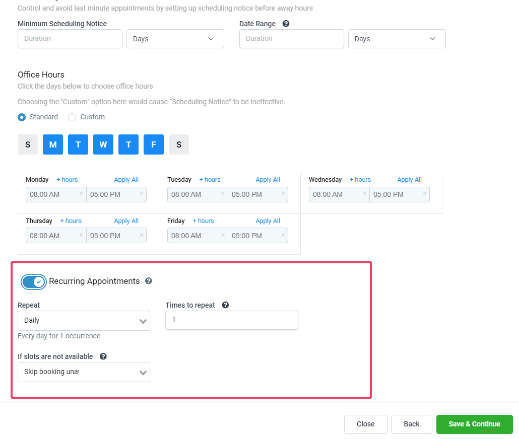 Once you toggle on the Recurring Appointments, you can see the recurring appointments settings, and you can select the settings based on your use case.