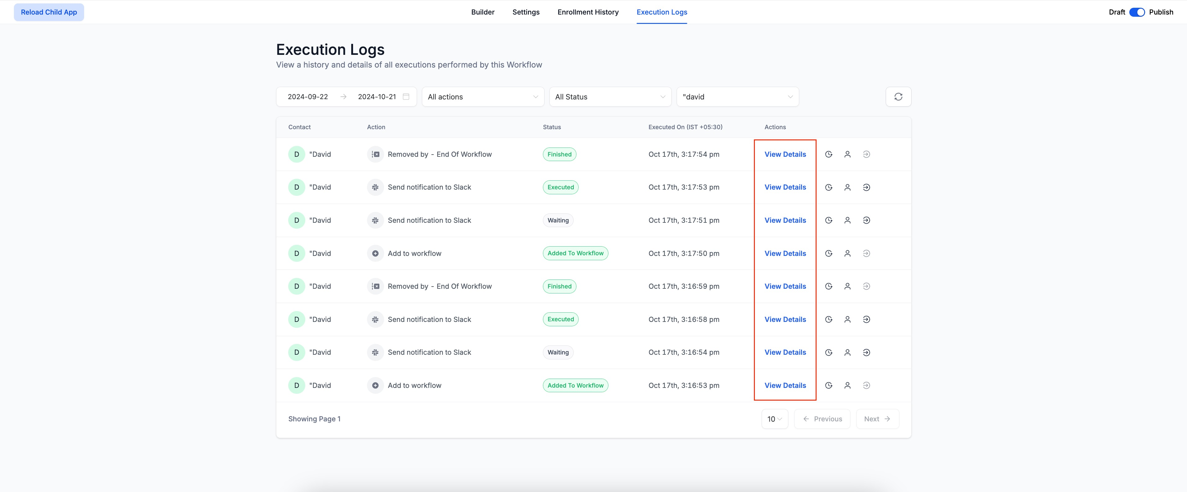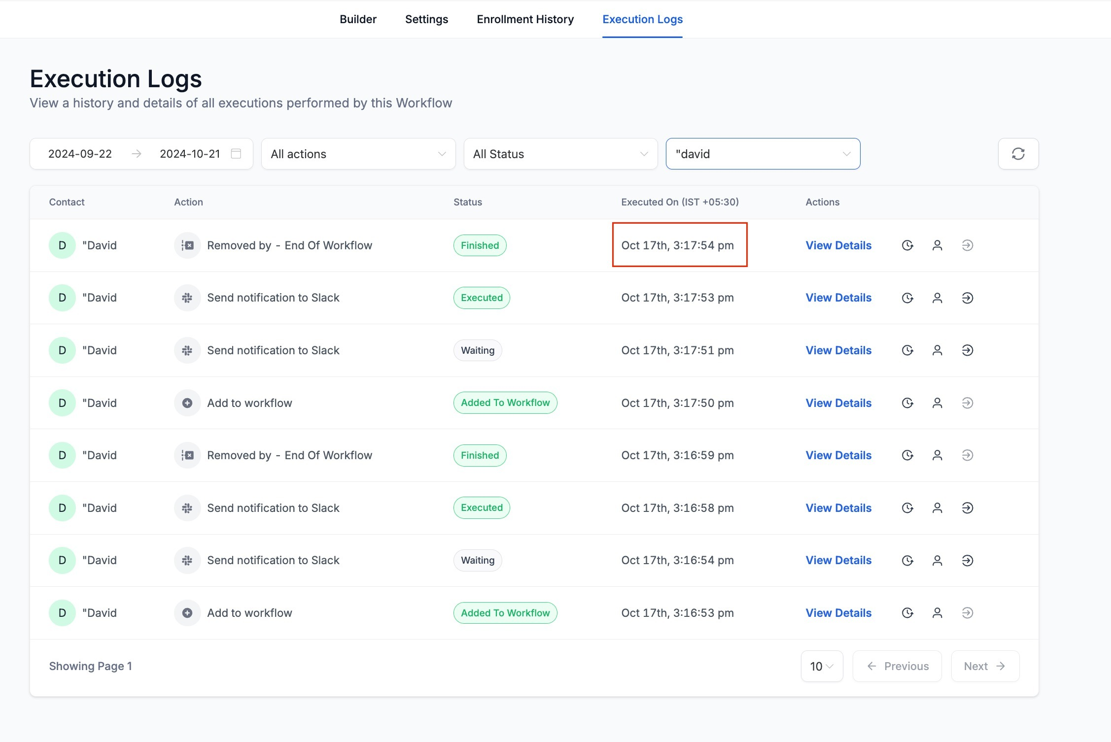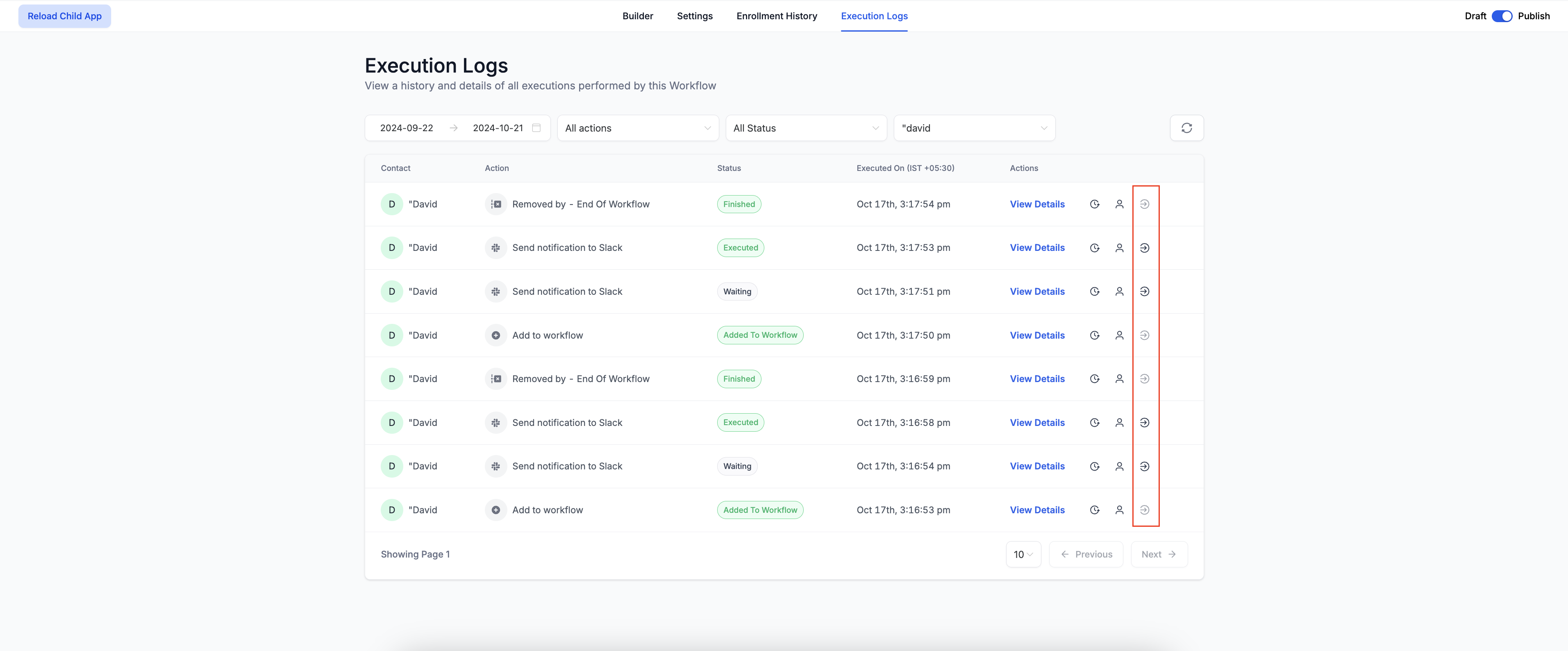 - On clicking the "View Execution History" icon in the Enrollment history or Execution logs. the execution history for that contact for a specific enrollment will open.