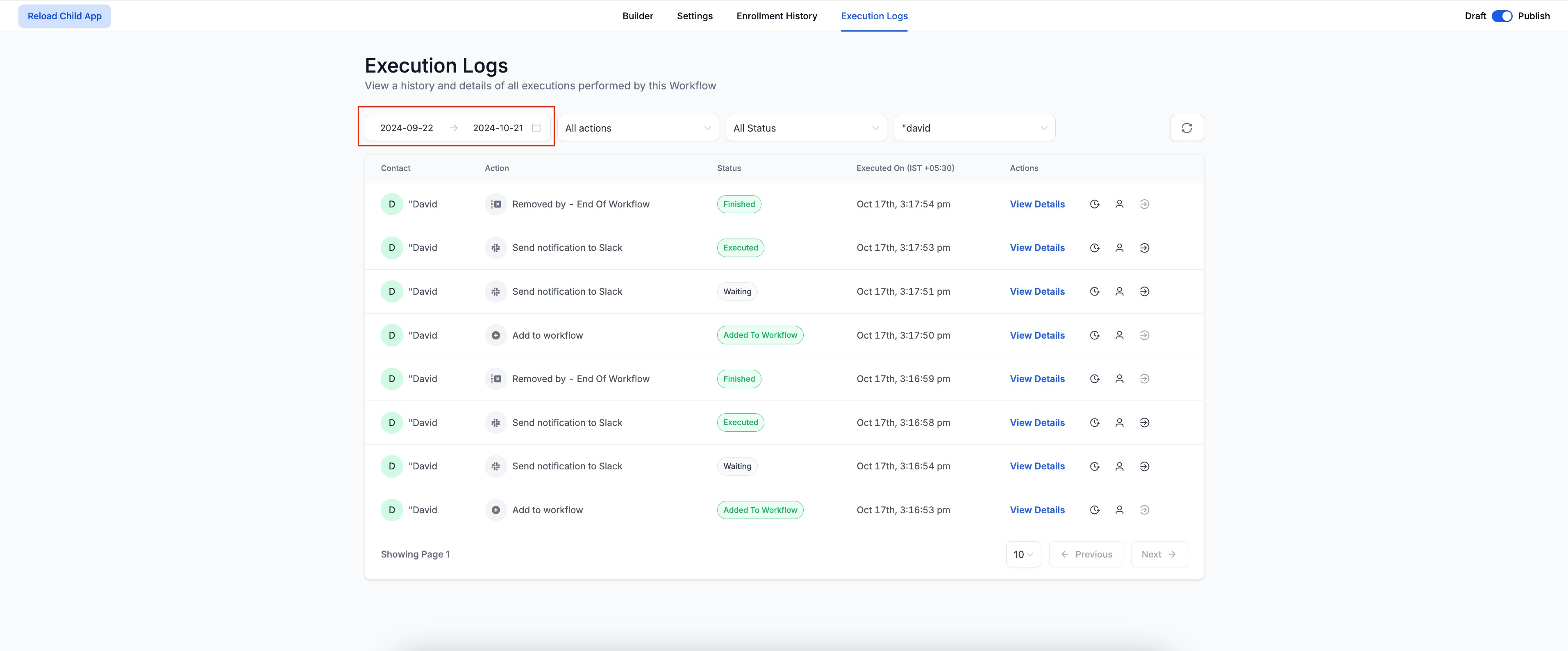 - In the logs all the action executions of the contact will be visible for all the enrollments the contacts have had for this workflow.