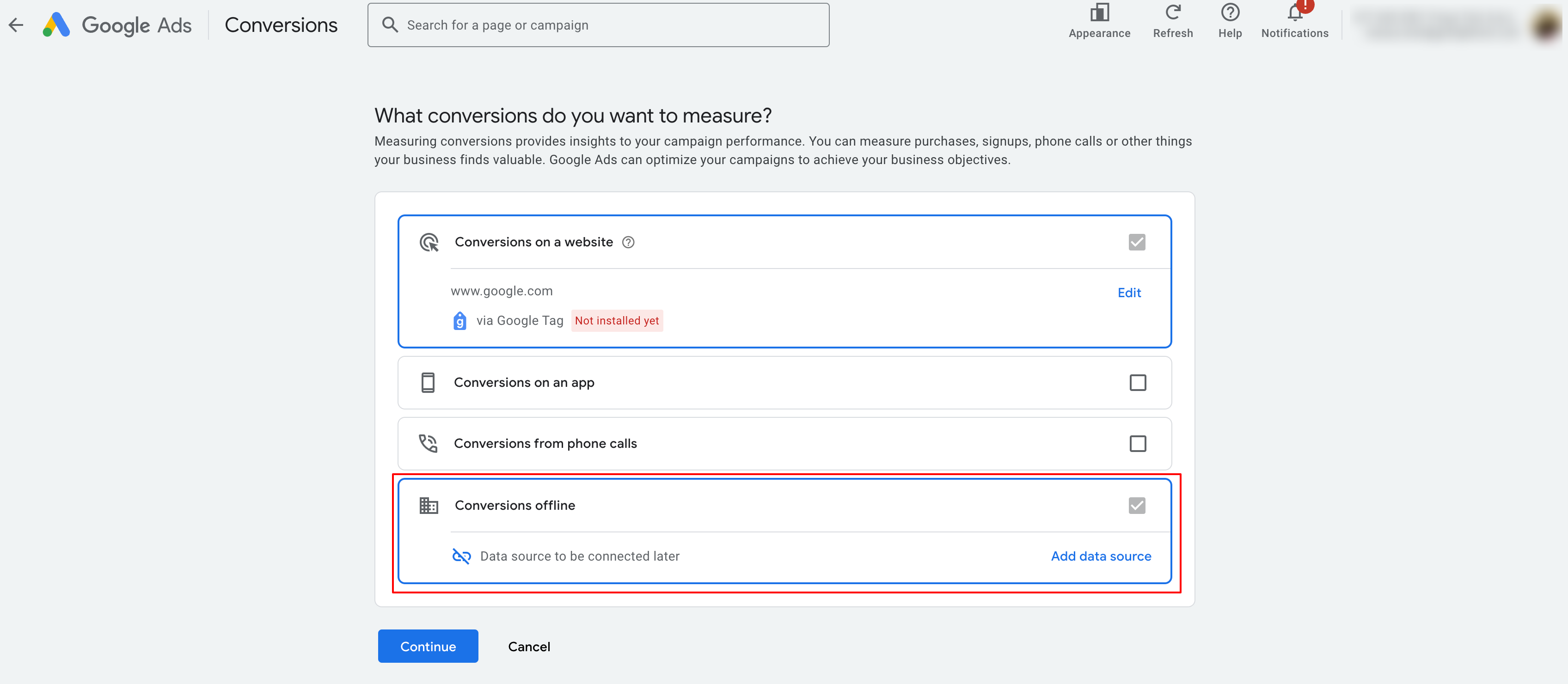 Click on the 'Create' button on top left and select 'Conversion action' to land on the same page as above to create a new conversion action.