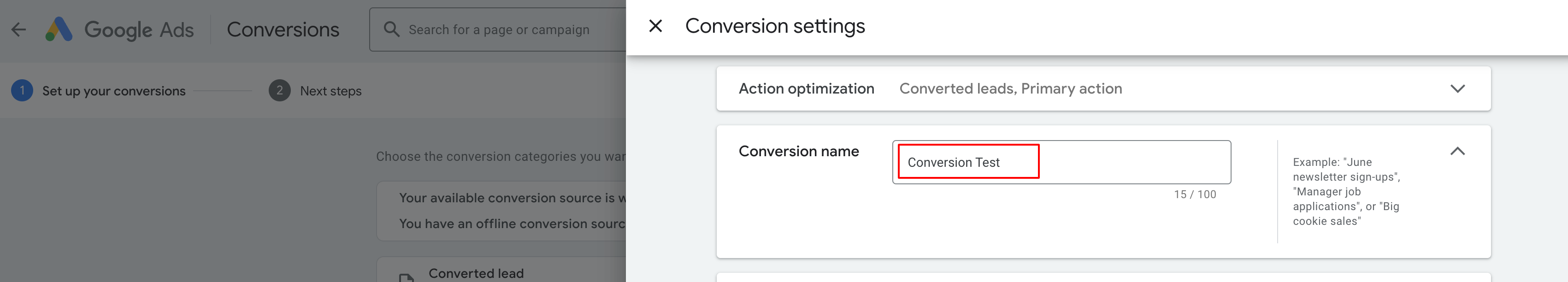 Please type in the name of your conversion. In this example, we are calling it "Conversion Test".