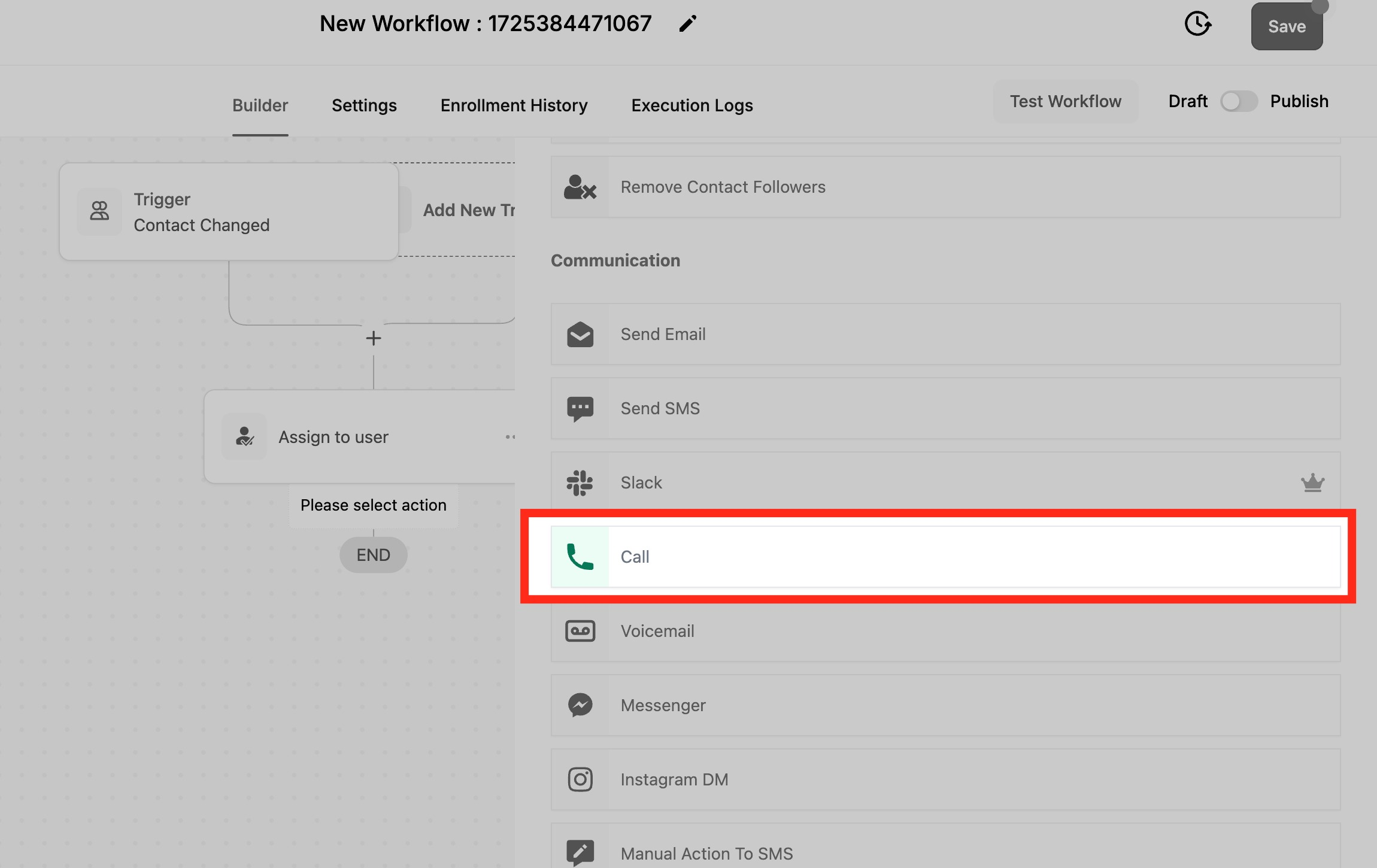 Lets Add "Call" action. Just click the "+" button and select "Call" action.