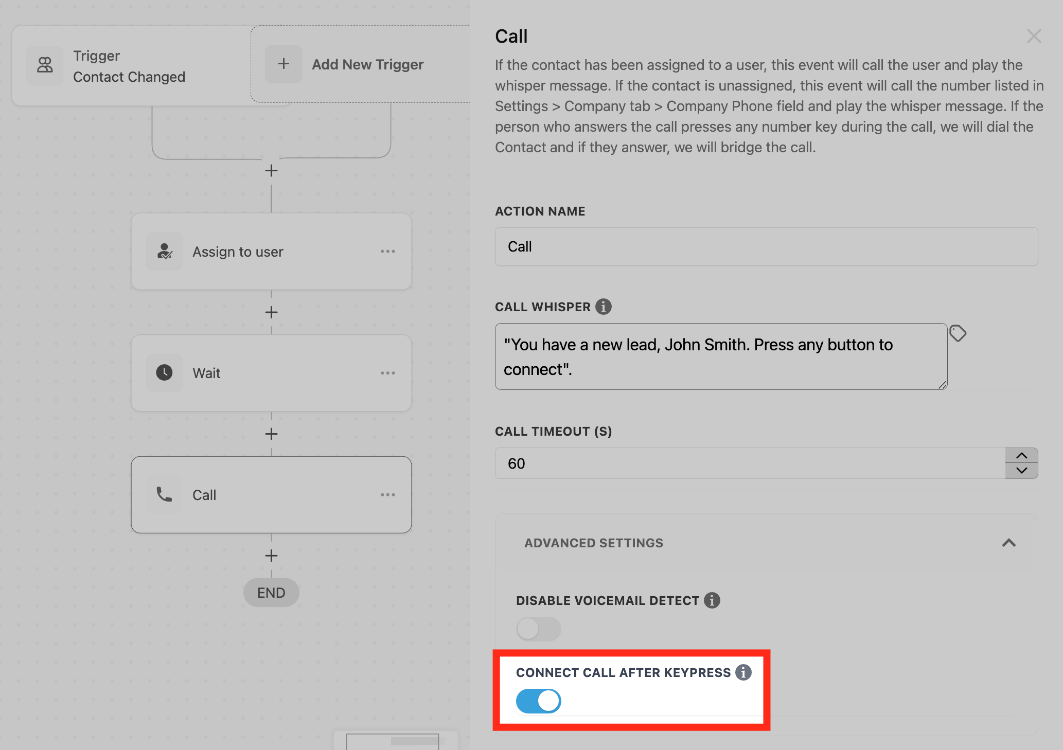 - By default, the call whisper states, "You have a new lead, John Smith. Press any button to connect".