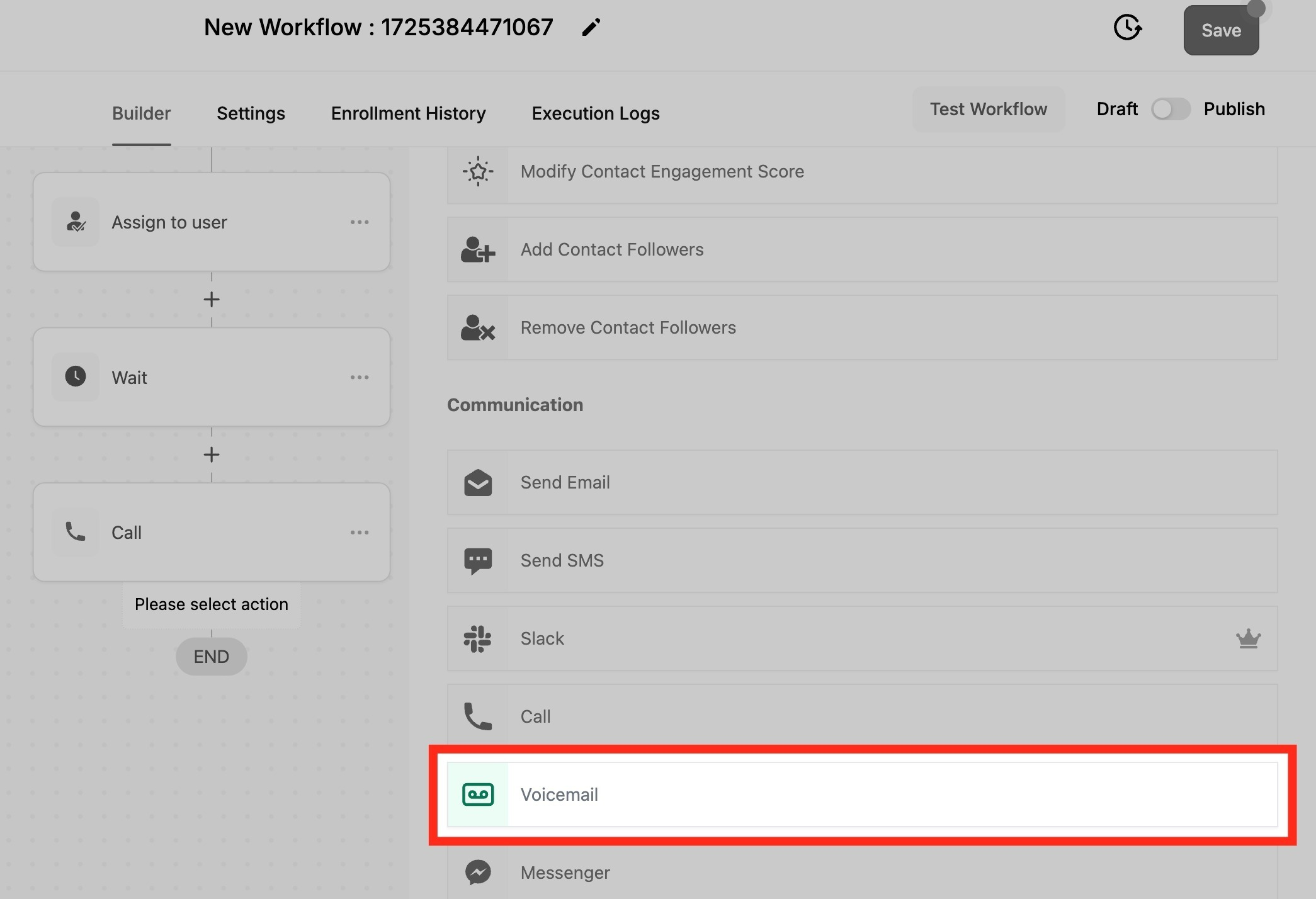 Now lets see how to add "Voicemail" action. for that, you will be using the same "+" button to add a new workflow action. Once you see the page with all the workflow actions, scroll down to find "Voicemail" option and click on it to proceed ahead.