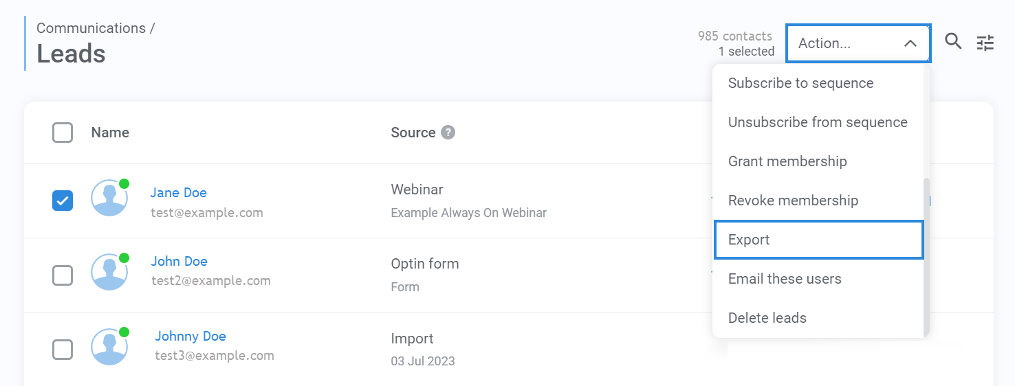 - Select Contacts: Select the leads/contacts you wish to export by ticking the checkboxes.
