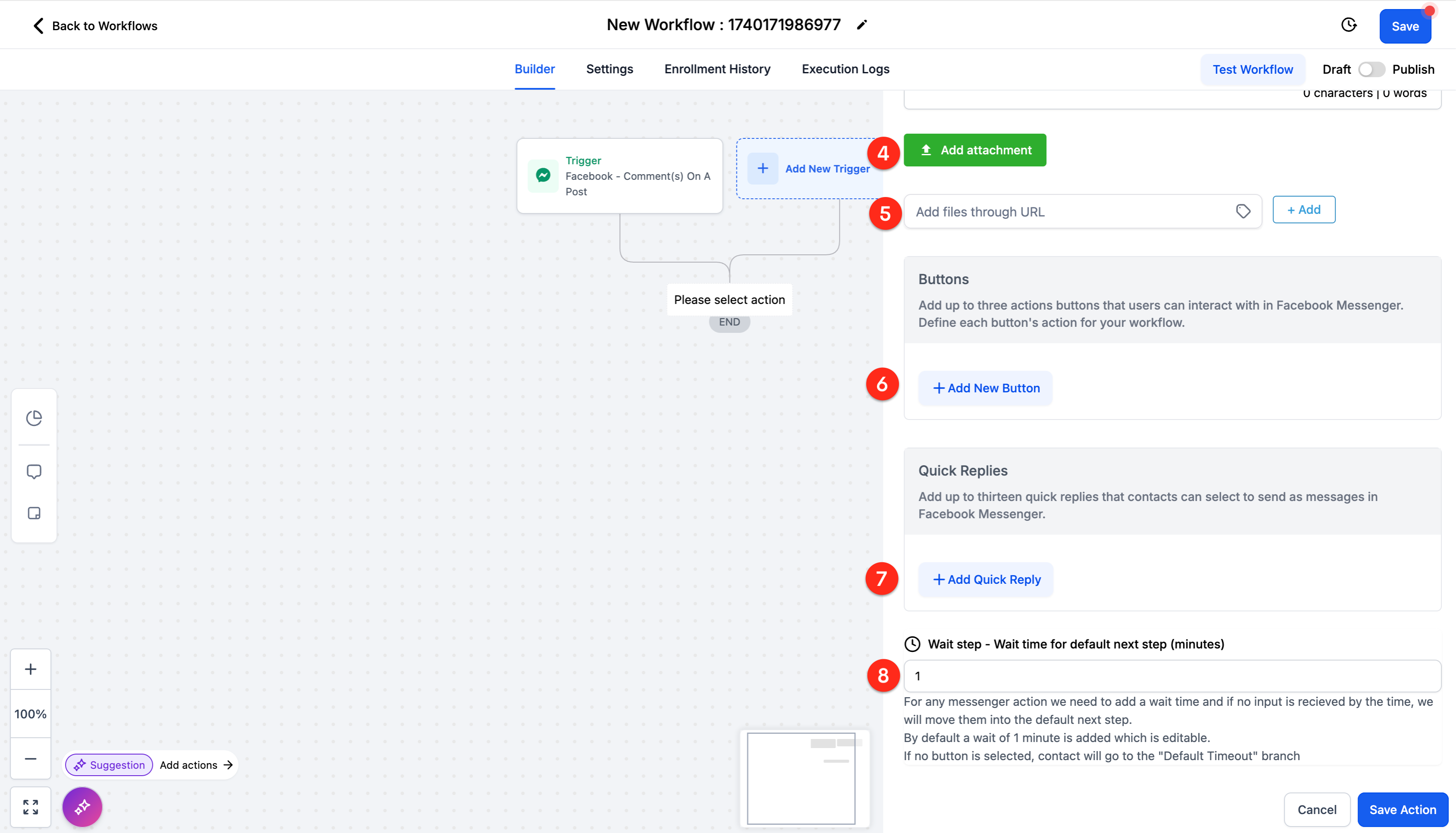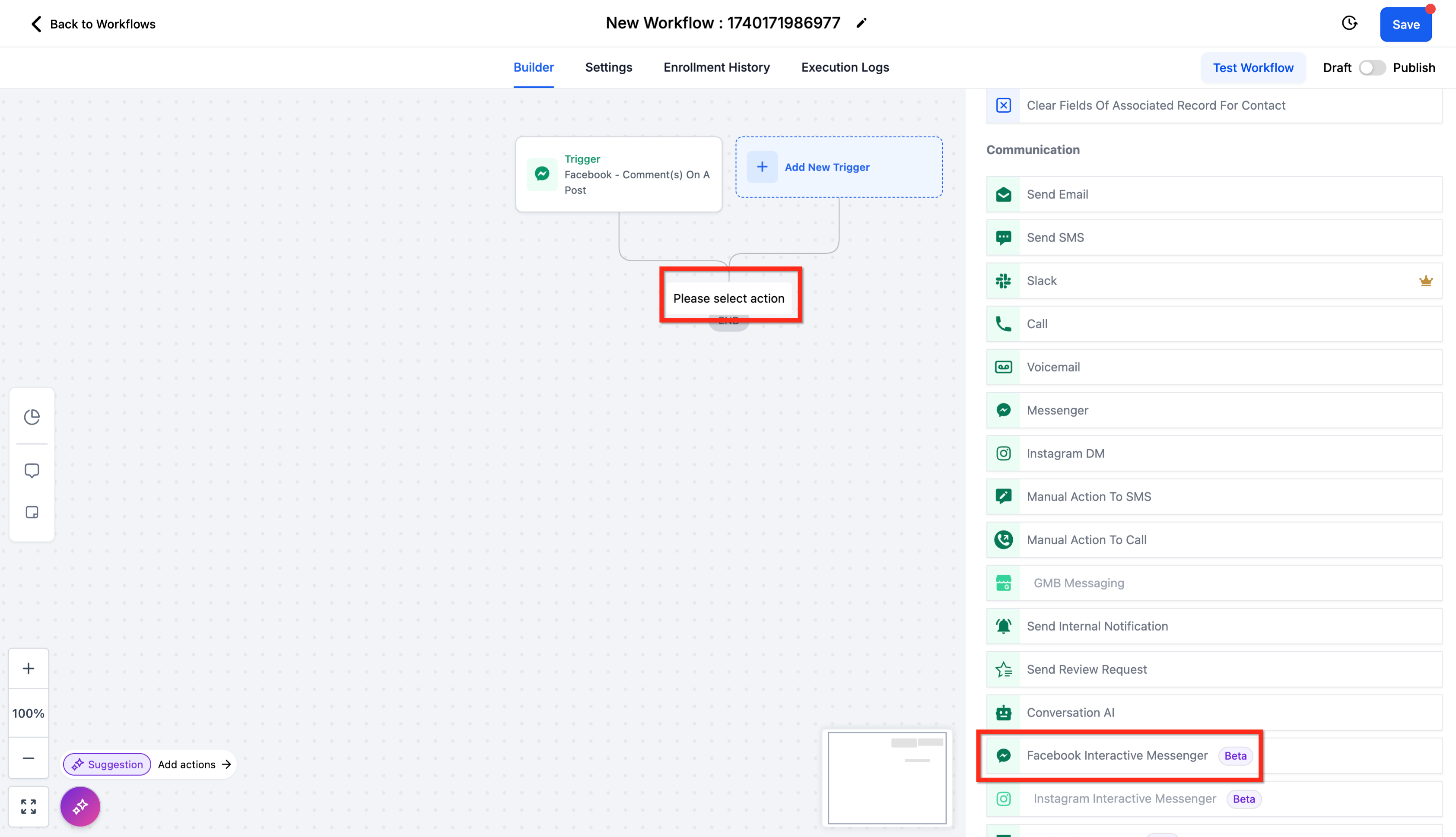 Navigate to Automation > Workflows > Workflow Builder > Actions > Communication > Facebook Interactive Messenger.