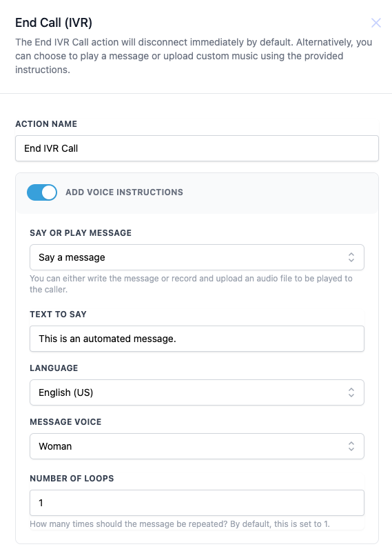 - Add Voice Instructions: Enable this toggle if you want to provide a final message before the call ends. Otherwise, the call will disconnect immediately.