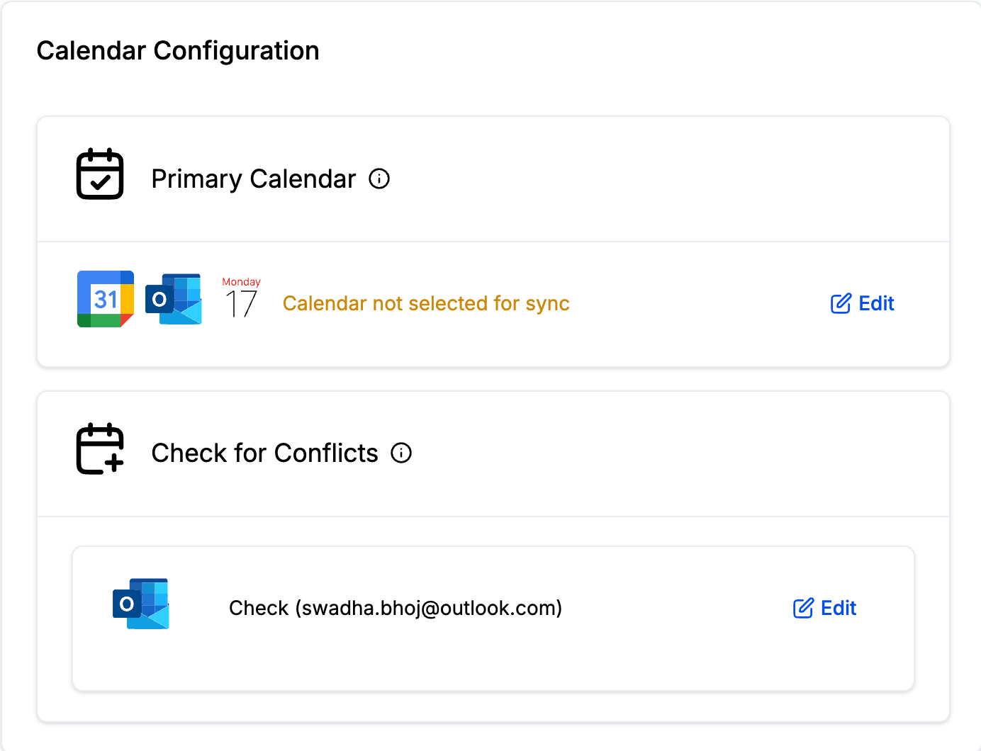You can configure your calendar under Settings > My Profile. There are primarily two settings, Primary Calendar and Check for Conflicts. All the third party calendar integrations added by the User are shown here.