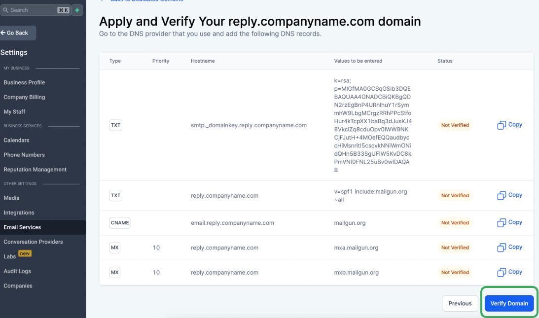 Click the same button to "Verify Domain" again if some records are still not showing the green checkmark