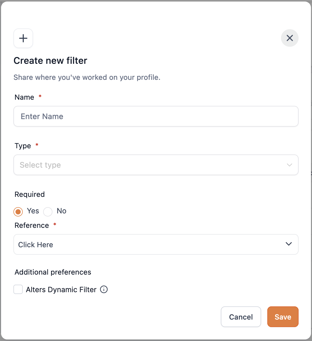 { "filters": [ { "field": "name", "title": "Name", "fieldType": "string", "required": true }, { "field": "gender", "title": "Gender", "fieldType": "select", "required": true, "options": [ { "label": "Male", "value": "male" }, { "label": "Female", "value": "female" } ] } ]}Sample structure for each Filter Types