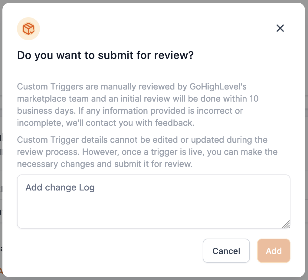 { "triggerData": { "id": "def", "key": "trigger_a", "filters": [ { "field": "country", "id": "country", "operator": "==", "title": "Country", "type": "select", "value": "USA" } ], "eventType": "DELETED", "targetUrl": "https://services.leadconnectorhq.com/workflows-marketplace/triggers/execute/abc/def" }, "meta": { "key": "trigger_a", "version": "2.4" }, "extras": { "locationId": "ghj", "workflowId": "qwe", "companyId": "asd" }}Submit for Review