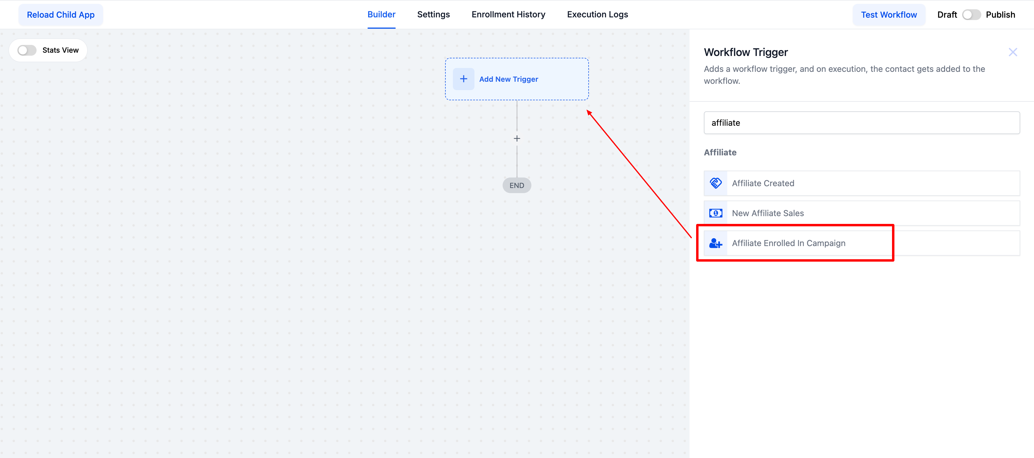 Note: If you do not see the “Affiliate Enrolled In Campaign” trigger in your workflow builder, ensure that the Affiliate Manager is enabled in your sub-account and that at least one affiliate campaign has been created. The trigger only appears when affiliate functionality is active in the sub-account.
