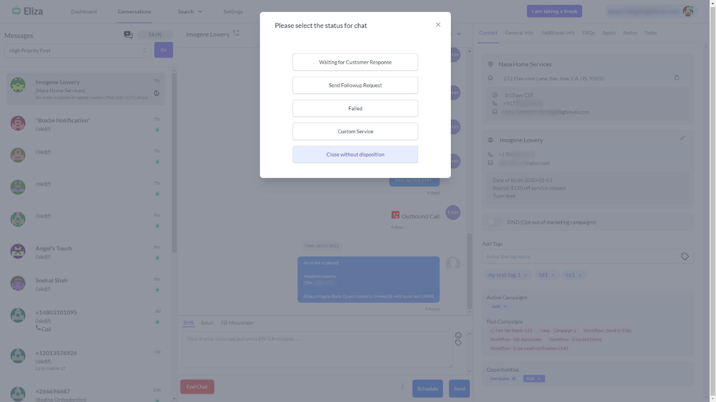 Alternatively, if the agent wants to see only these contacts, they can filter for "Send to Eliza" and respond immediately upon arrival.