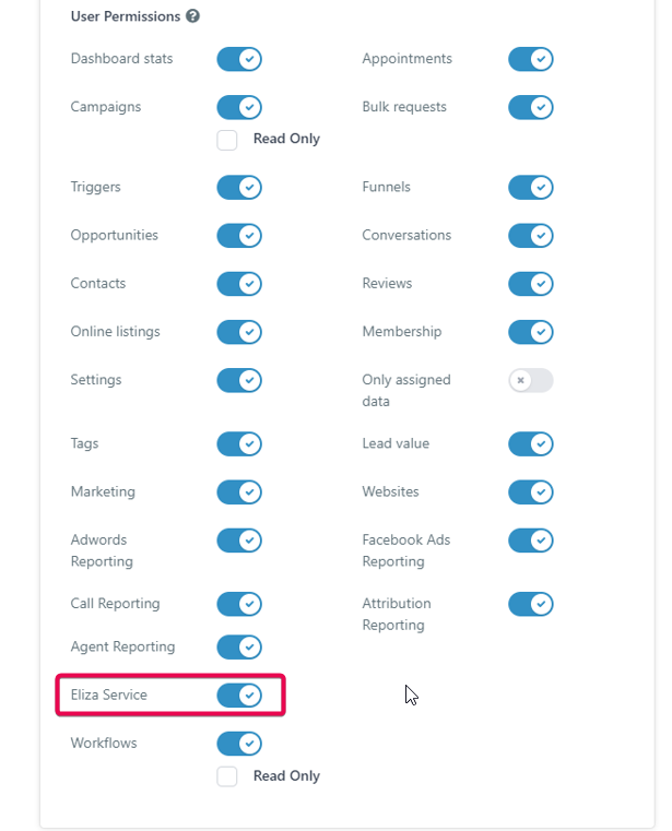 To add the Eliza Service tab in the sub-account settings, You need to go to the user permissions and toggle the Eliza Service tab to grant access to that user. Once the access is granted, the Eliza Service tab will show up in the sub-account settings for you.