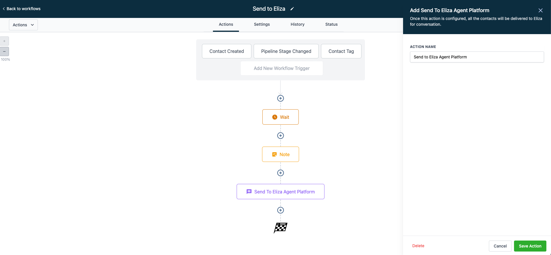 - Send to Eliza Agent Platform Action in Actionera Workflow