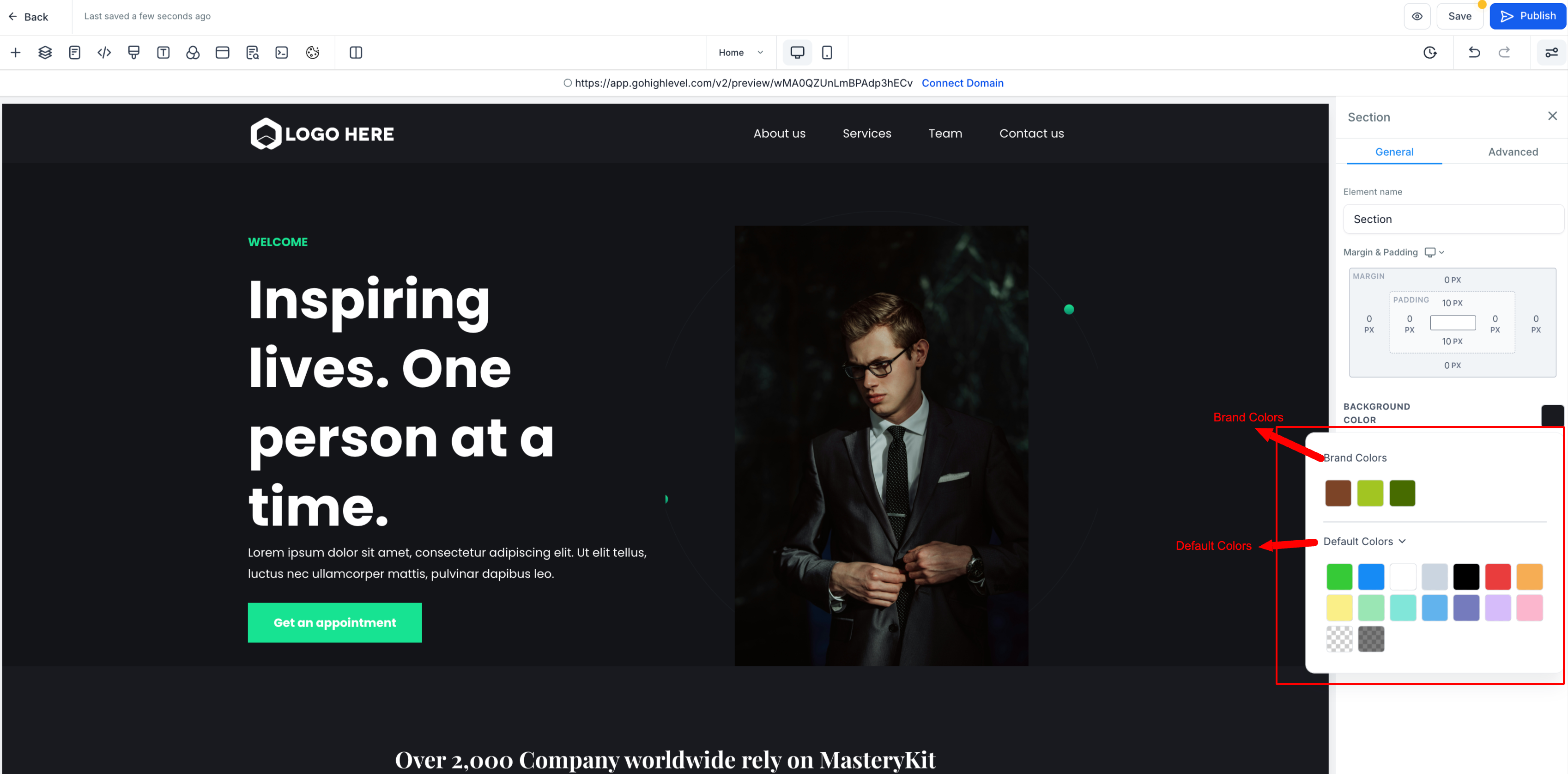 - Brand Colors: Use these for colors you want to be consistent across all pages and products. Brand Colors ensure uniformity throughout your funnel or website.