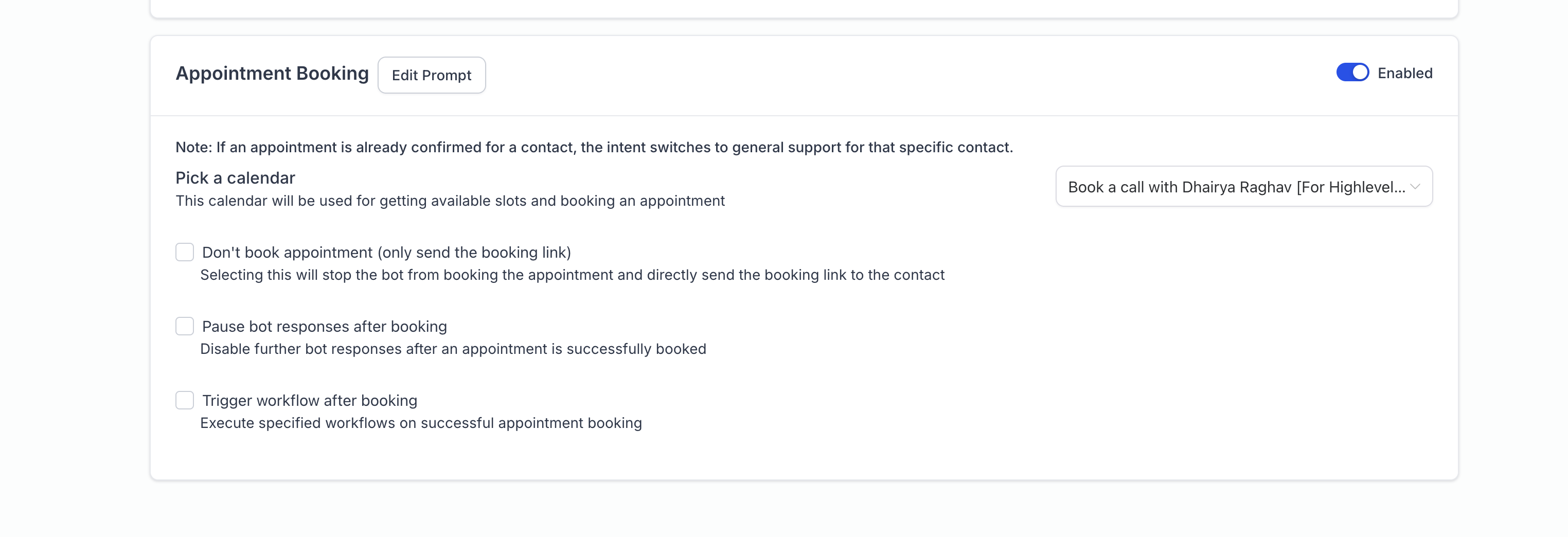 We are thrilled to introduce a significant enhancement to our Conversation AI platform—Sub-Account Appointment Booking Intent. This powerful feature allows users to effortlessly configure post-appointment booking actions, elevating the overall user experience.