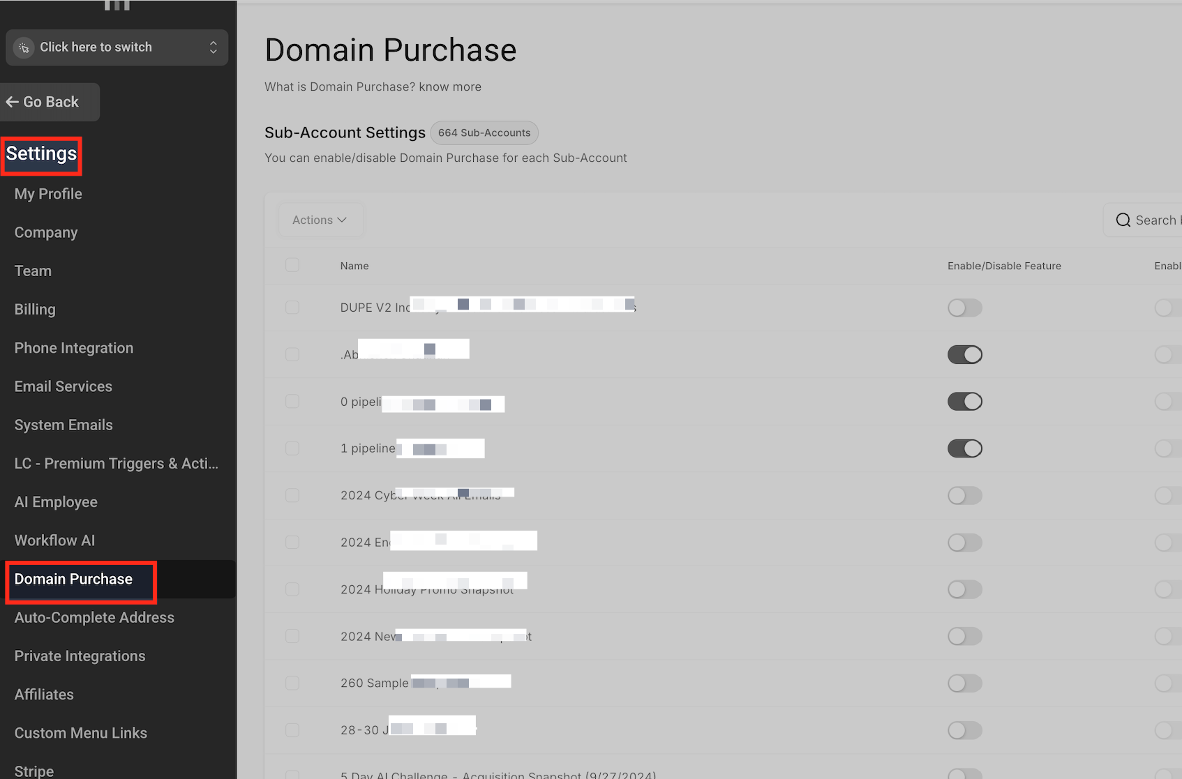 - Navigate to Settings → Company → Domain Purchase. Toggle the setting ON to activate domain purchasing functionality across the platform.