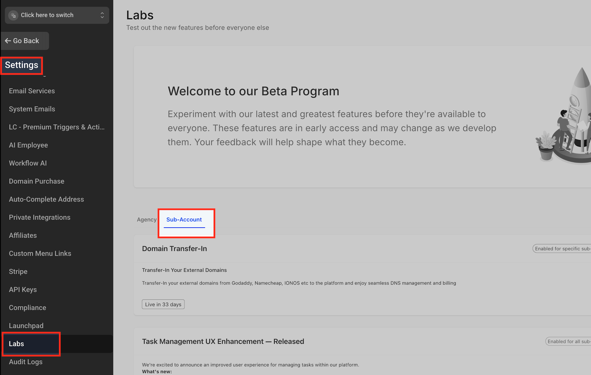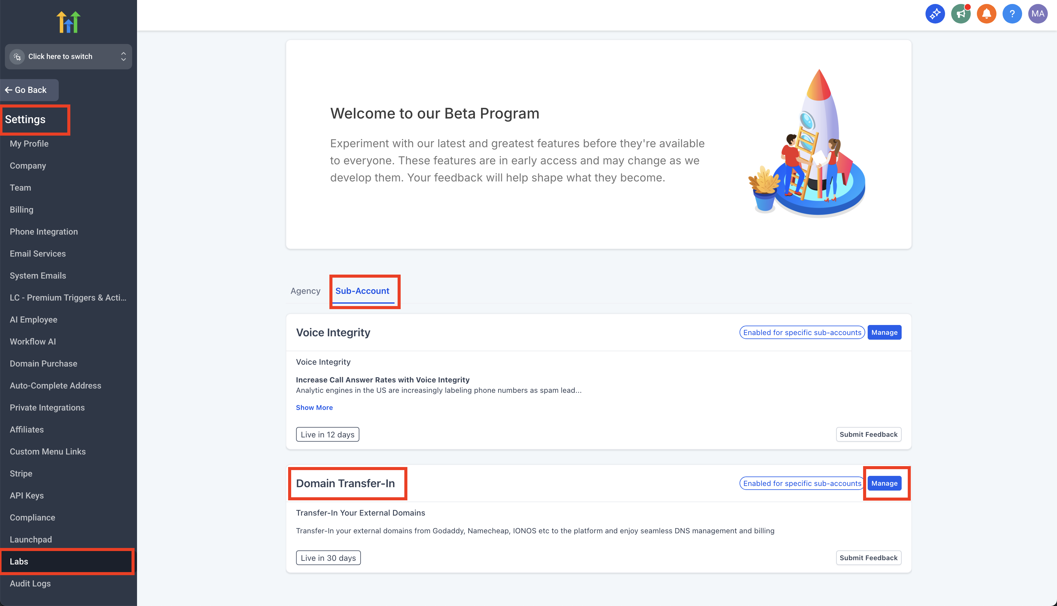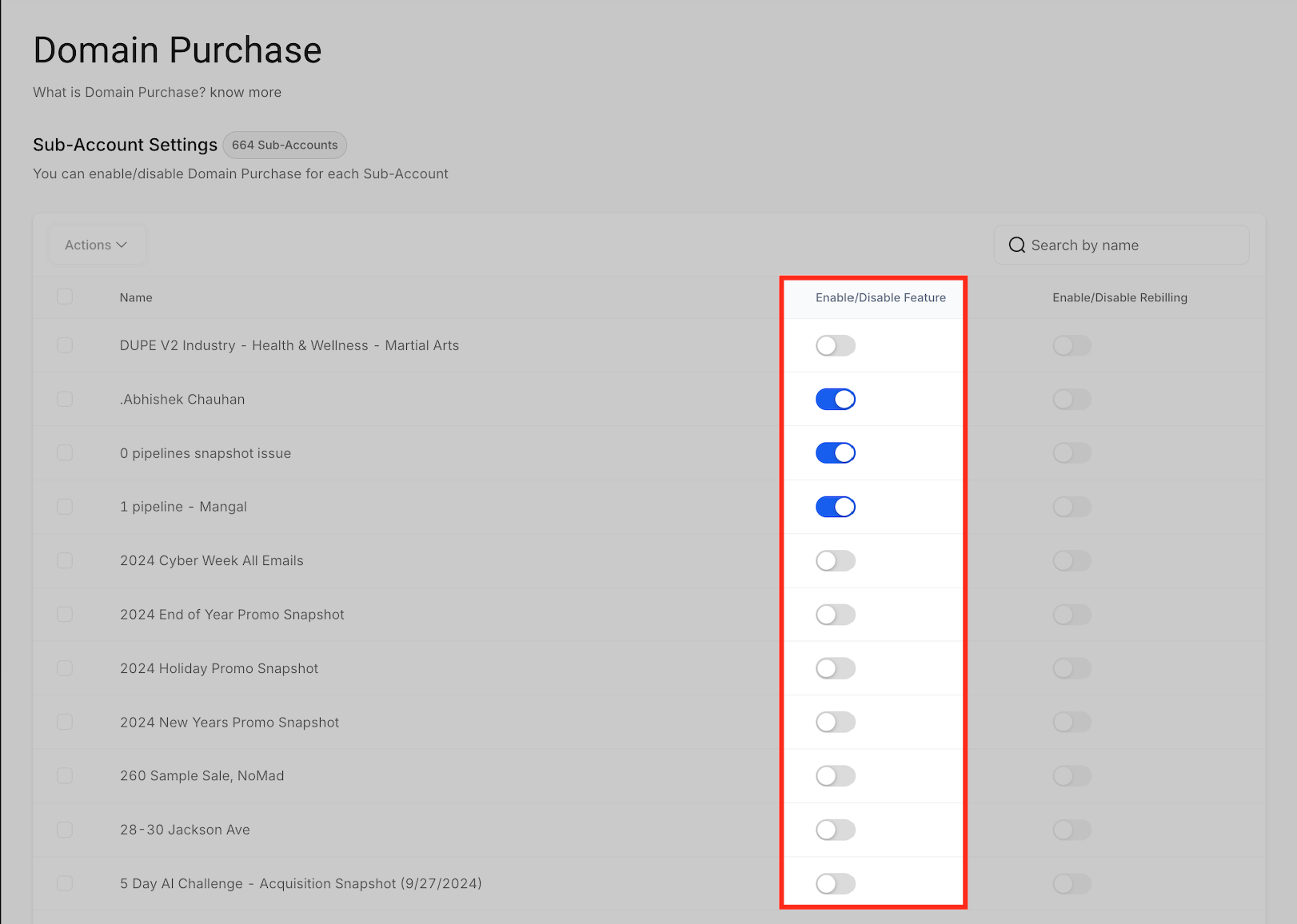 - Enable domain purchasing individually for each sub-account that will use the Domain Transfer-In feature.