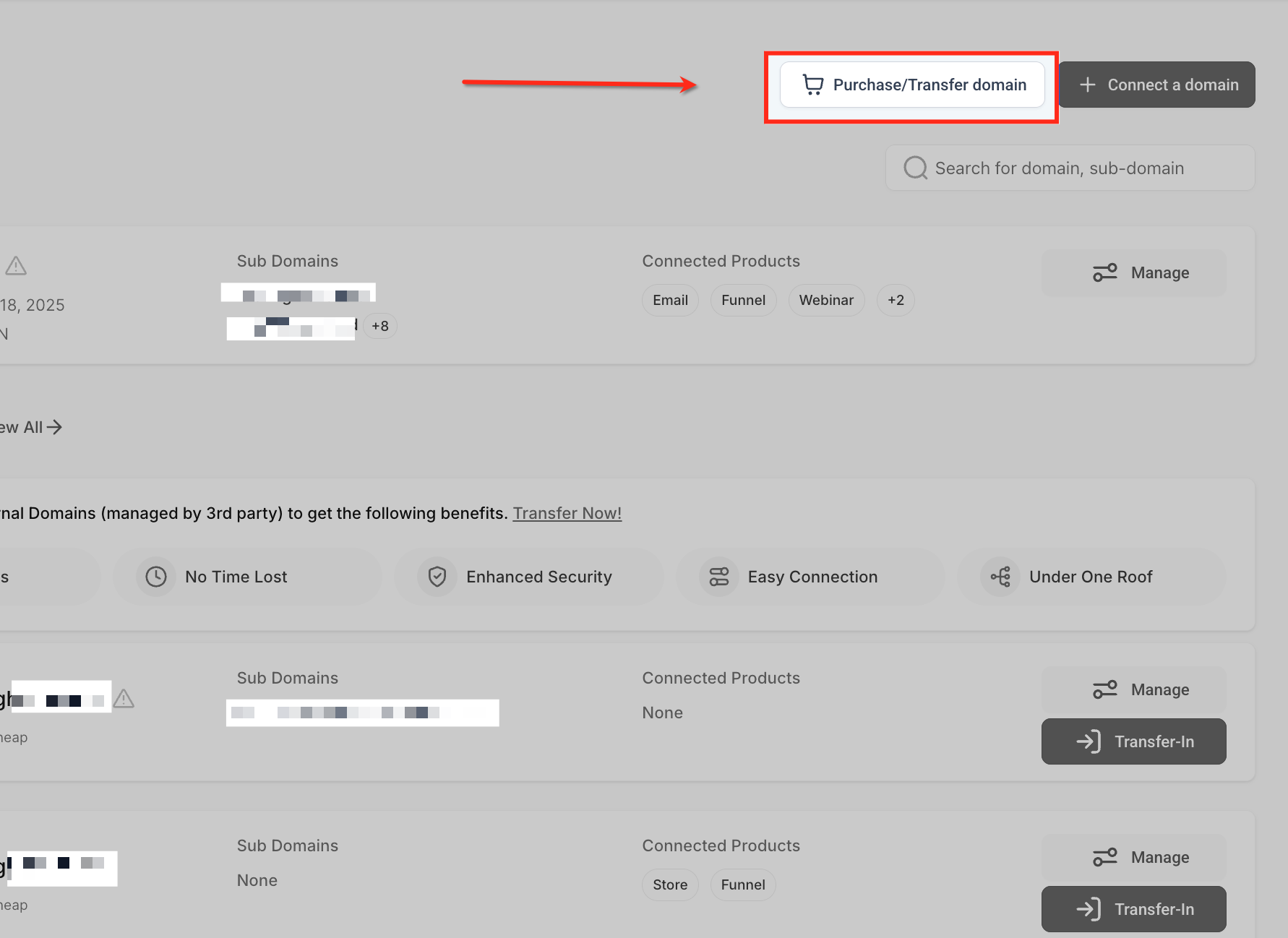 Domain Transfer-In is a built-in Actionera feature that allows users to move domain ownership and management from third-party registrars (such as GoDaddy, Namecheap, etc.) into the Actionera platform. This simplifies your workflow by letting you purchase, transfer, renew, and manage DNS records without ever leaving your sub-account. The Domains page acts as your centralized dashboard for all domain activity, improving visibility and control.