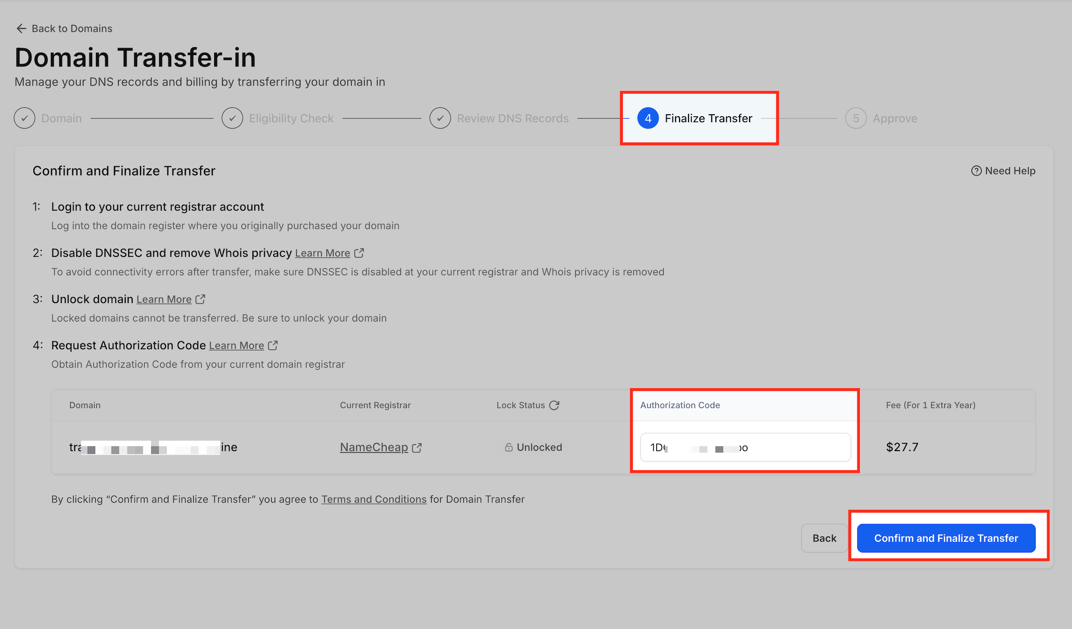 - The system will verify whether the domain is eligible for transfer. You’ll also see the transfer fee and domain expiration details here.