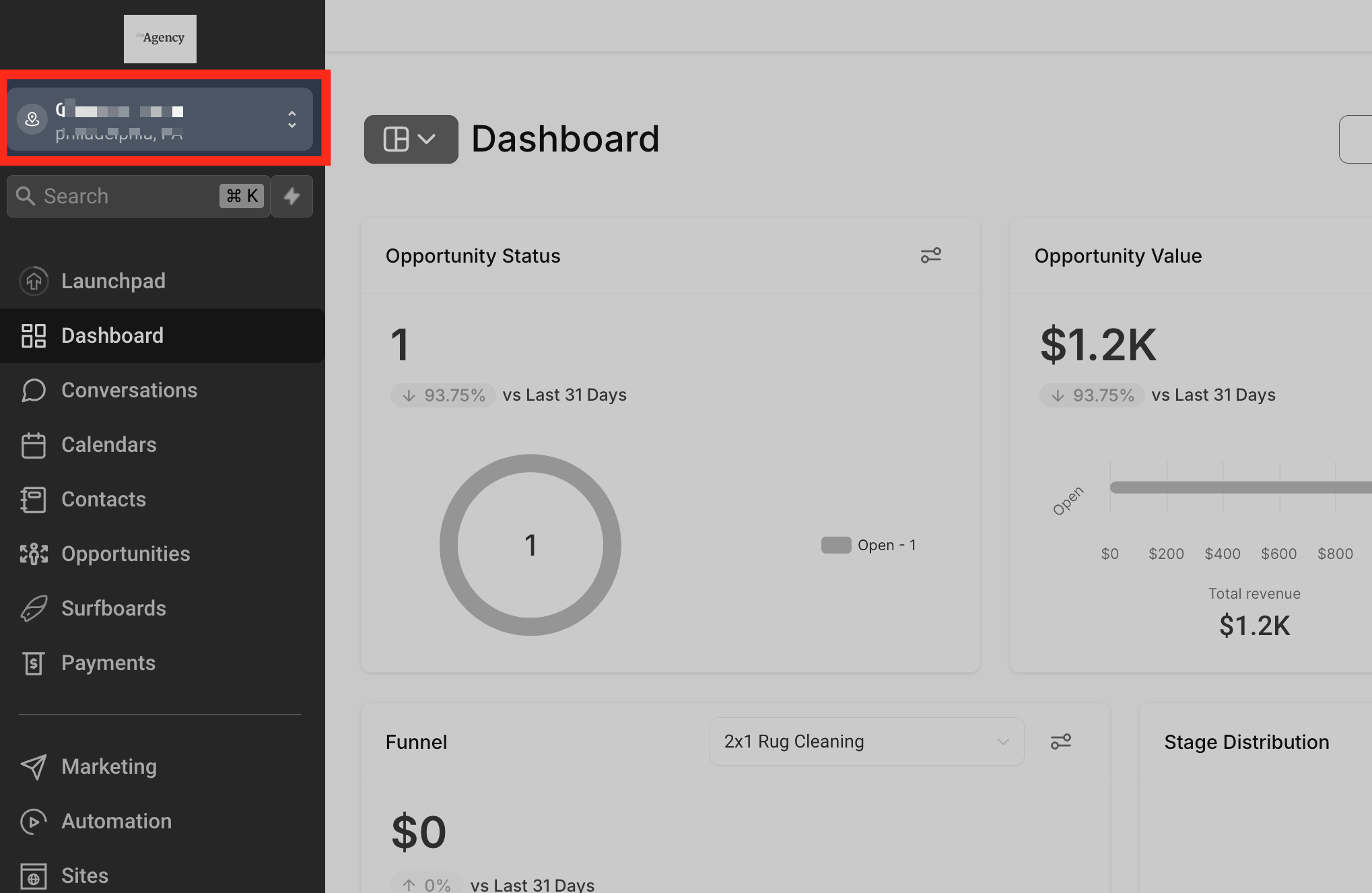 Step 1: If you are in a "Agency View" you will need to go to the sub account. Click the Sub account switcher tab located at the top left corner.