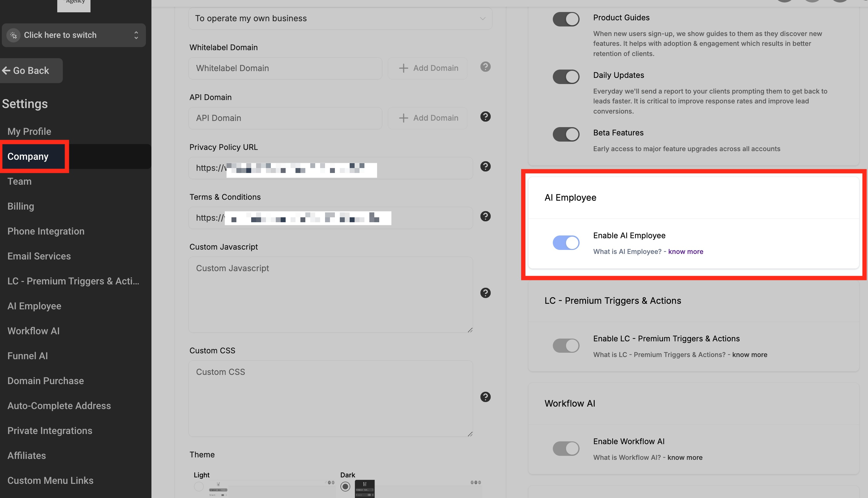 To enable "AI Employee" for your agency, check the AI employee toggle in the "Company" tab of your Agency Settings.