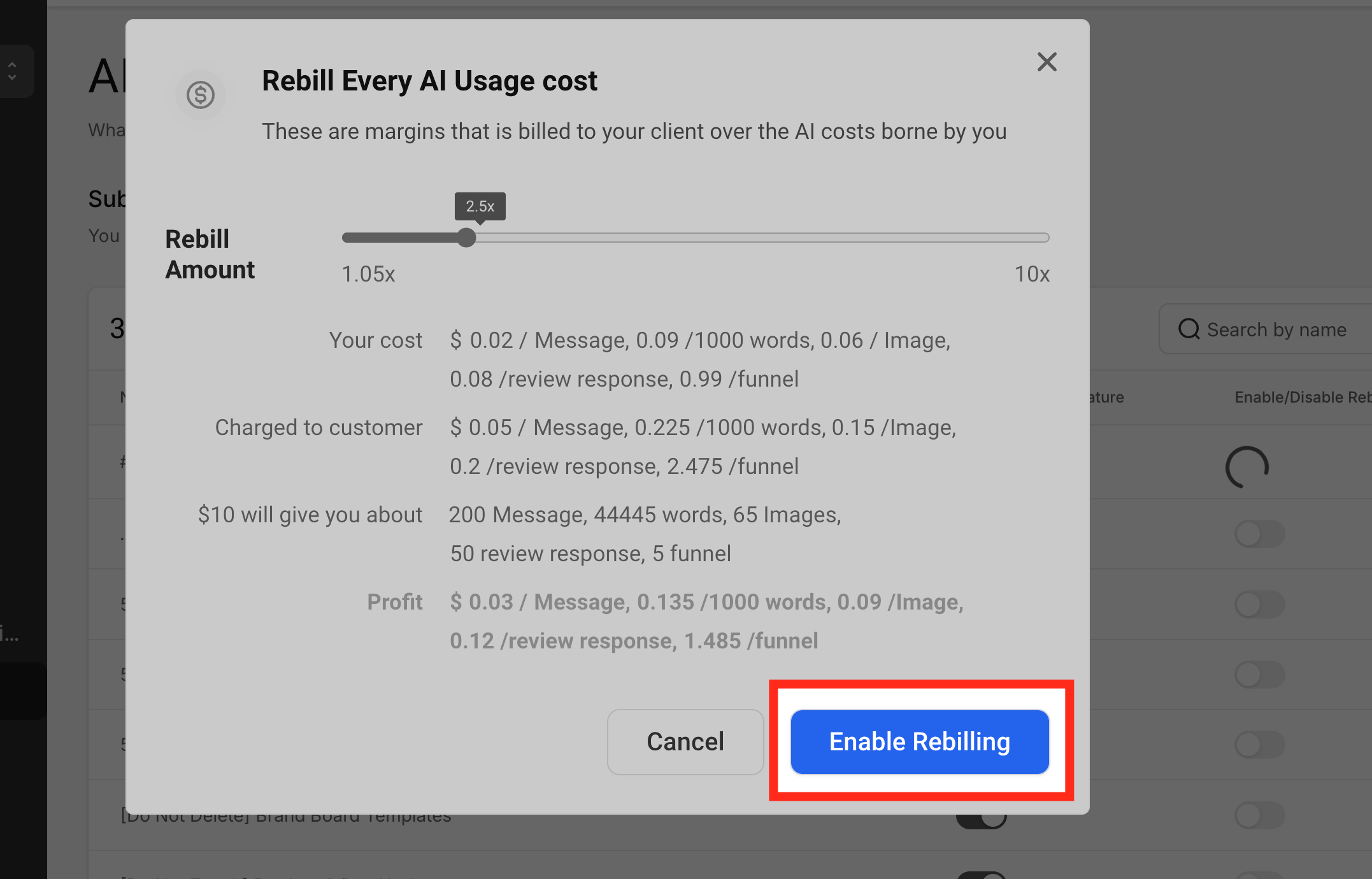 You can also choose to enable or disable rebilling for each sub-account and set the rebelling amount. Enabling the toggle will open up a page where you will be able to set the rebilling amount. Lets turn one of the toggle on.