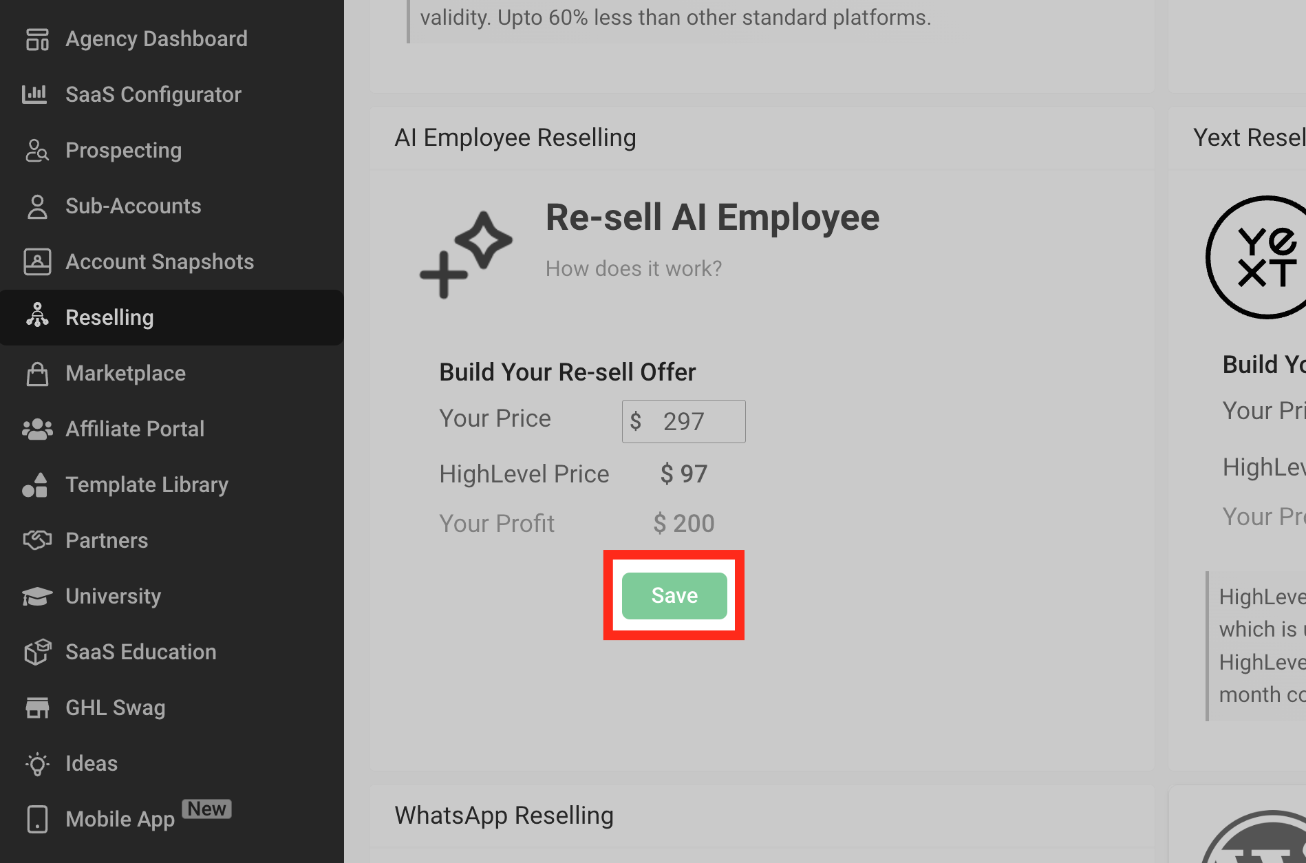 Scroll down to find "AI Employee Reselling" option. This is the area where you can customize your offer.