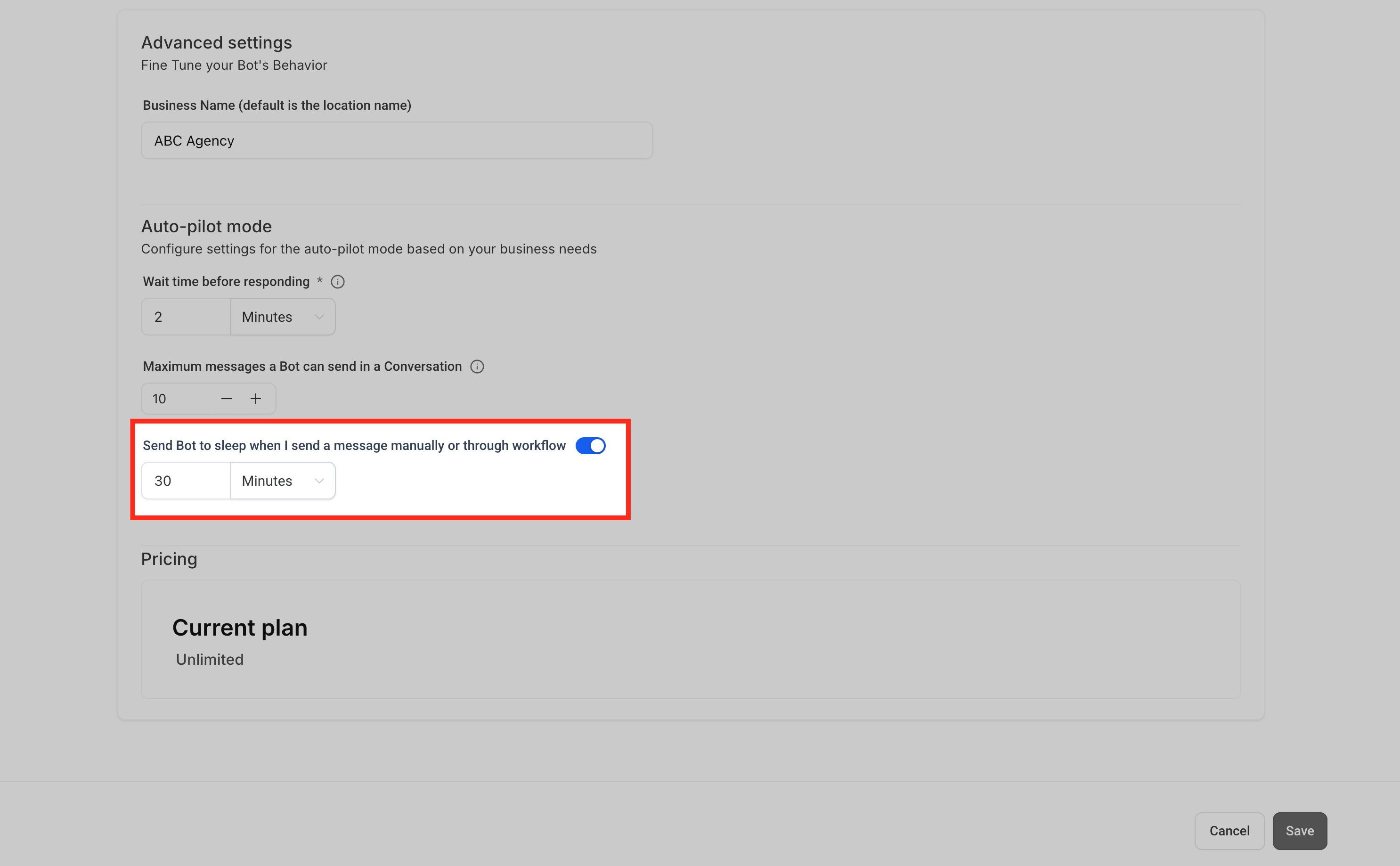 - Send Bot to Sleep: Temporarily disable the bot during manual interventions or workflows.